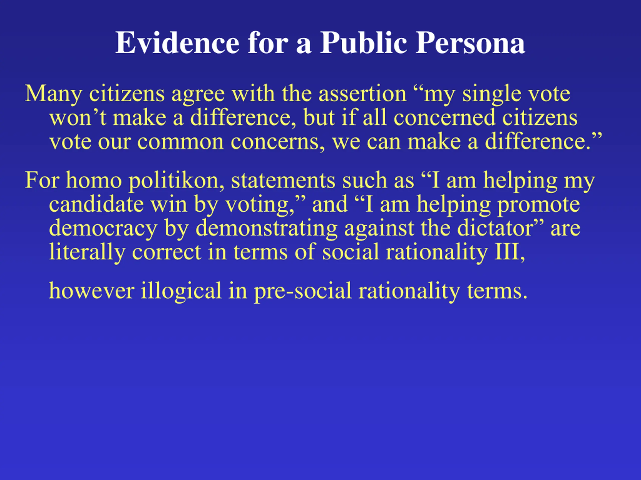 Evidence for a Public Persona Many citizens agree with the assertion my single vote won t make a difference, but if all concerned citizens vote our common concerns, we can make a difference. For homo politikon, statements such as I am helping my candidate win by voting, and I am helping promote democracy by demonstrating against the dictator are literally correct in terms of social rationality III, however illogical in pre-social rationality terms.