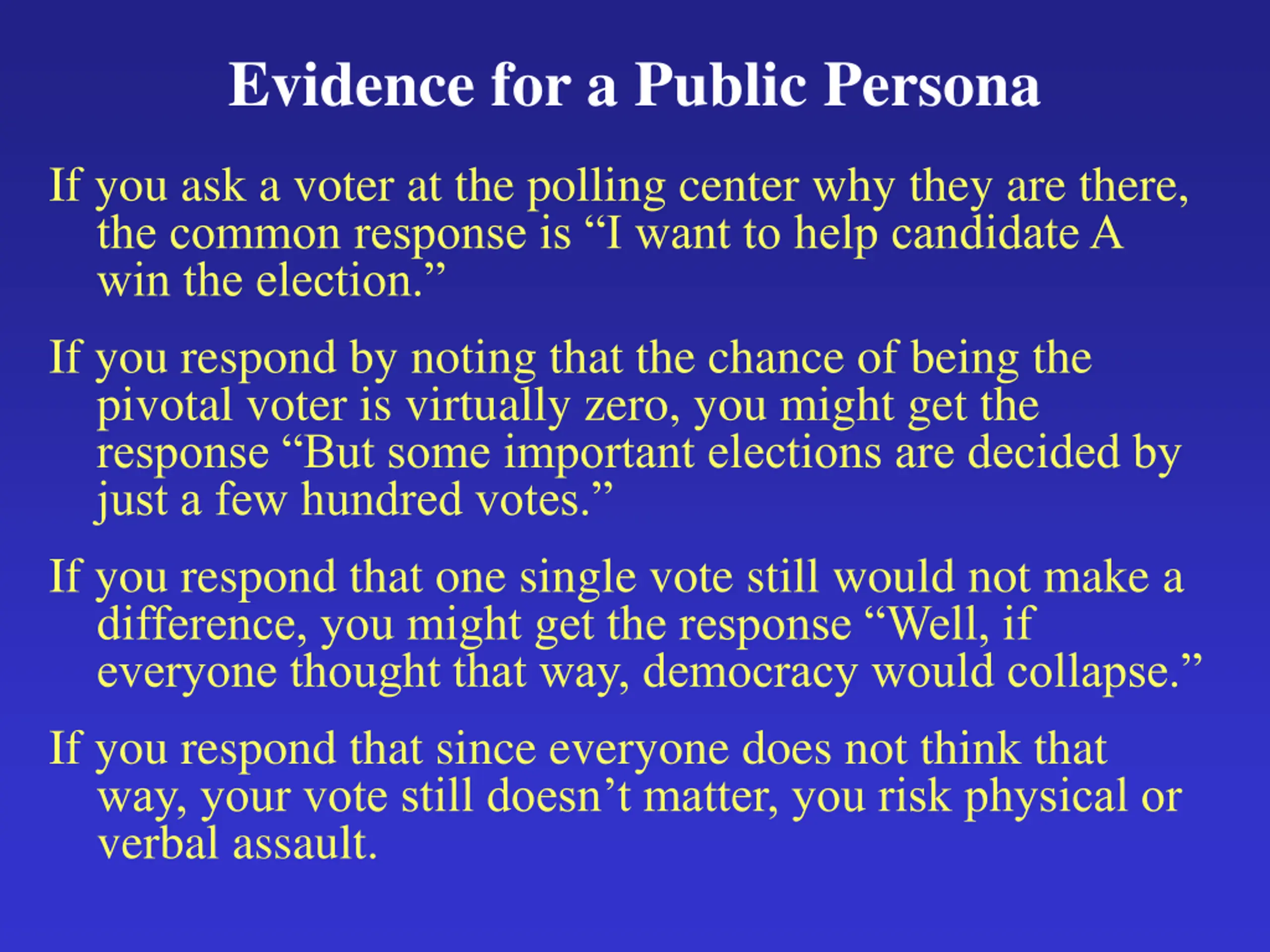 Evidence for a Public Persona If you ask a voter at the polling center why they are there, the common response is I want to help candidate A win the election. If you respond by noting that the chance of being the pivotal voter is virtually zero, you might get the response But some important elections are decided by just a few hundred votes. If you respond that one single vote still would not make a difference, you might get the response Well, if everyone thought that way, democracy would collapse. If you respond that since everyone does not think that way, your vote still doesn t matter, you risk physical or verbal assault.