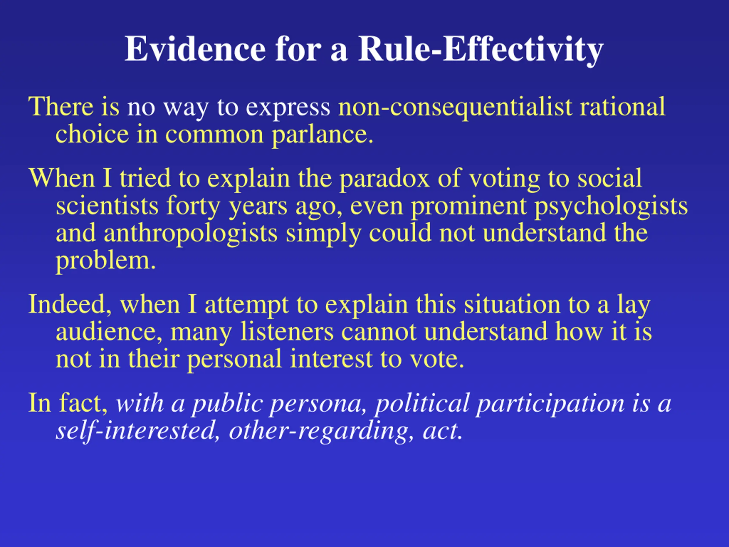 Evidence for a Rule-Effectivity There is no way to express non-consequentialist rational choice in common parlance. When I tried to explain the paradox of voting to social scientists forty years ago, even prominent psychologists and anthropologists simply could not understand the problem. Indeed, when I attempt to explain this situation to a lay audience, many listeners cannot understand how it is not in their personal interest to vote. In fact, with a public persona, political participation is a self-interested, other-regarding, act.