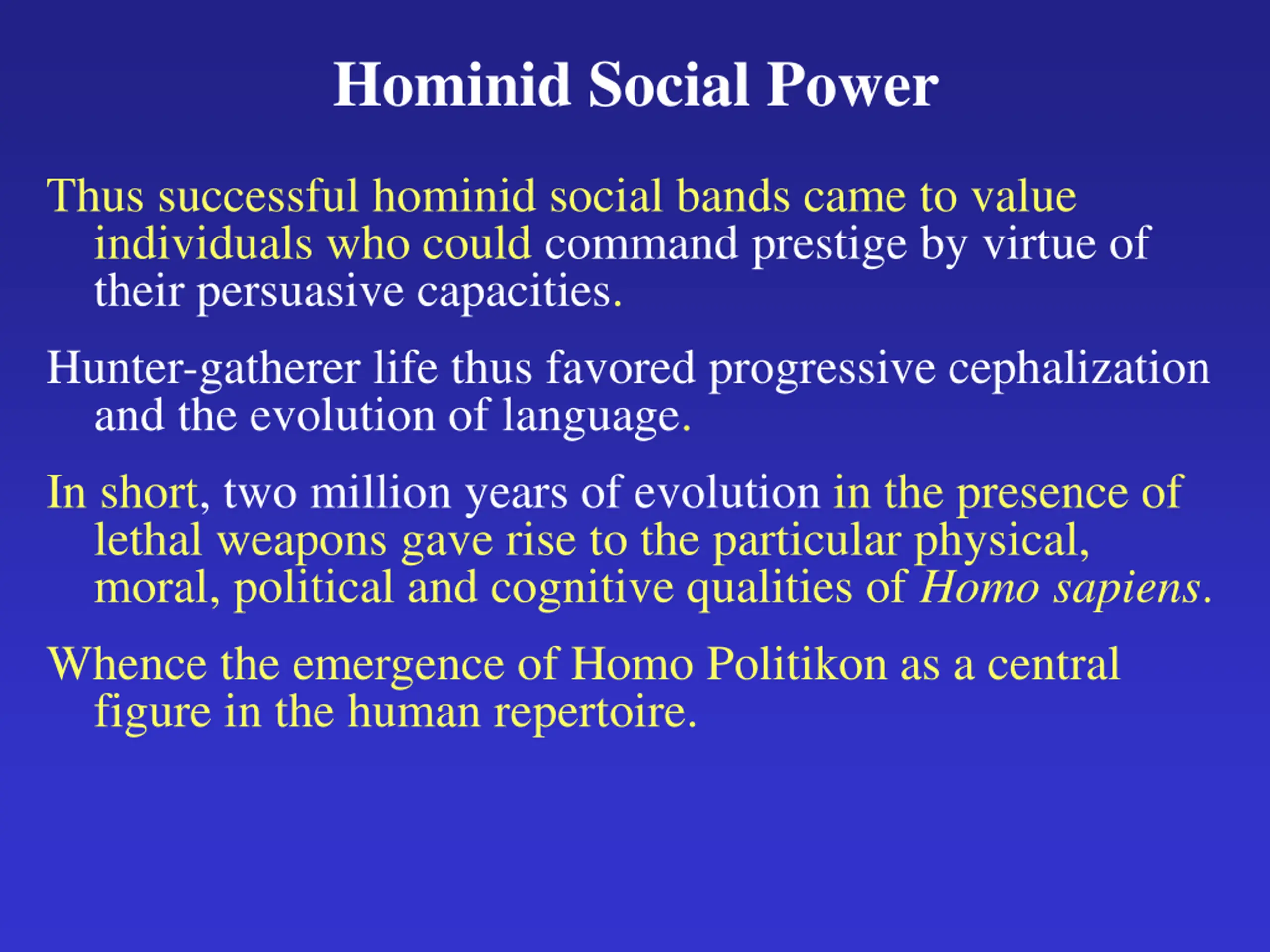 Hominid Social Power Thus successful hominid social bands came to value individuals who could command prestige by virtue of their persuasive capacities. Hunter-gatherer life thus favored progressive cephalization and the evolution of language. In short, two million years of evolution in the presence of lethal weapons gave rise to the particular physical, moral, political and cognitive qualities of Homo sapiens. Whence the emergence of Homo Politikon as a central figure in the human repertoire.