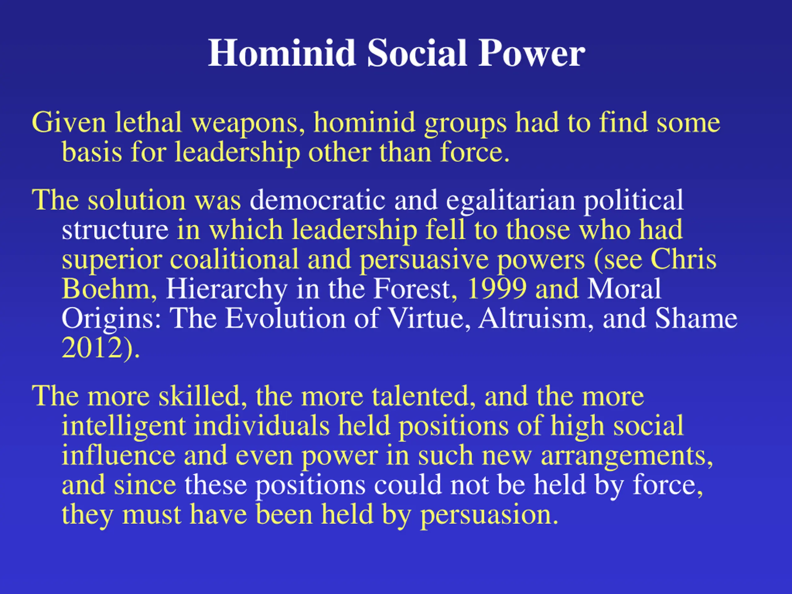 Hominid Social Power Given lethal weapons, hominid groups had to find some basis for leadership other than force. The solution was democratic and egalitarian political structure in which leadership fell to those who had superior coalitional and persuasive powers (see Chris Boehm, Hierarchy in the Forest, 1999 and Moral Origins: The Evolution of Virtue, Altruism, and Shame 2012). The more skilled, the more talented, and the more intelligent individuals held positions of high social influence and even power in such new arrangements, and since these positions could not be held by force, they must have been held by persuasion.