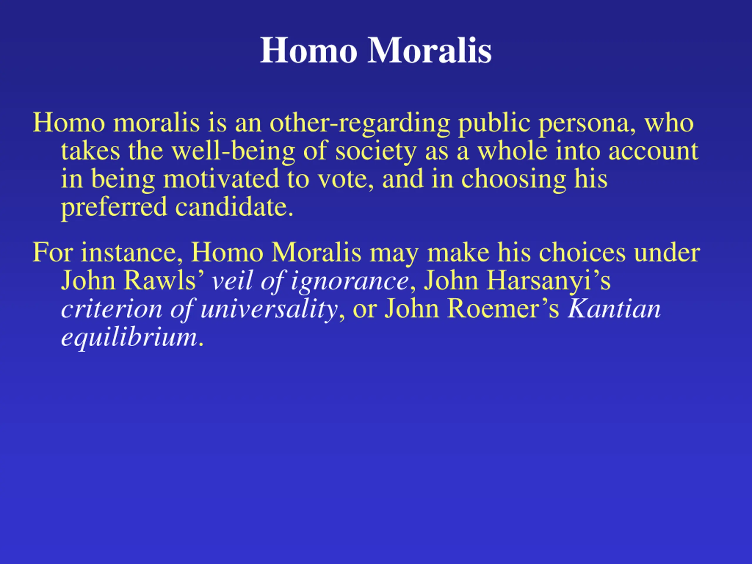 Homo Moralis Homo moralis is an other-regarding public persona, who takes the well-being of society as a whole into account in being motivated to vote, and in choosing his preferred candidate. For instance, Homo Moralis may make his choices under John Rawls veil of ignorance, John Harsanyi s criterion of universality, or John Roemer s Kantian equilibrium.