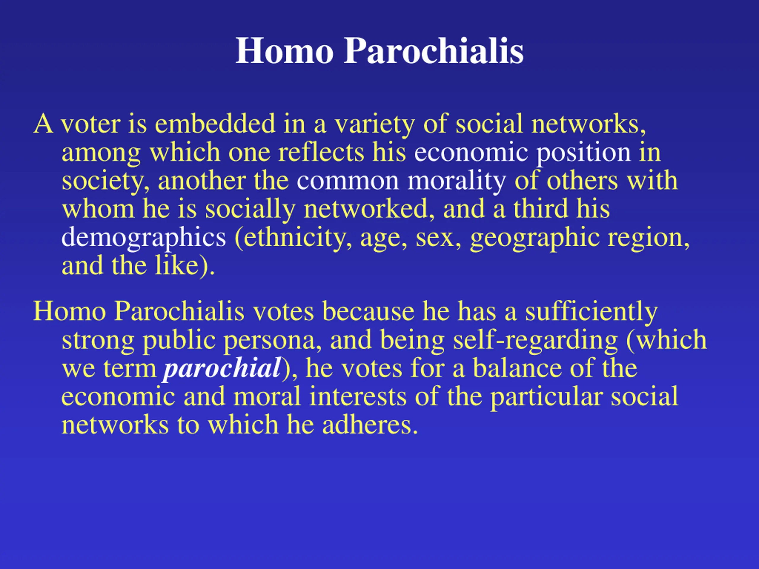 Homo Parochialis A voter is embedded in a variety of social networks, among which one reflects his economic position in society, another the common morality of others with whom he is socially networked, and a third his demographics (ethnicity, age, sex, geographic region, and the like). Homo Parochialis votes because he has a sufficiently strong public persona, and being self-regarding (which we term parochial), he votes for a balance of the economic and moral interests of the particular social networks to which he adheres.