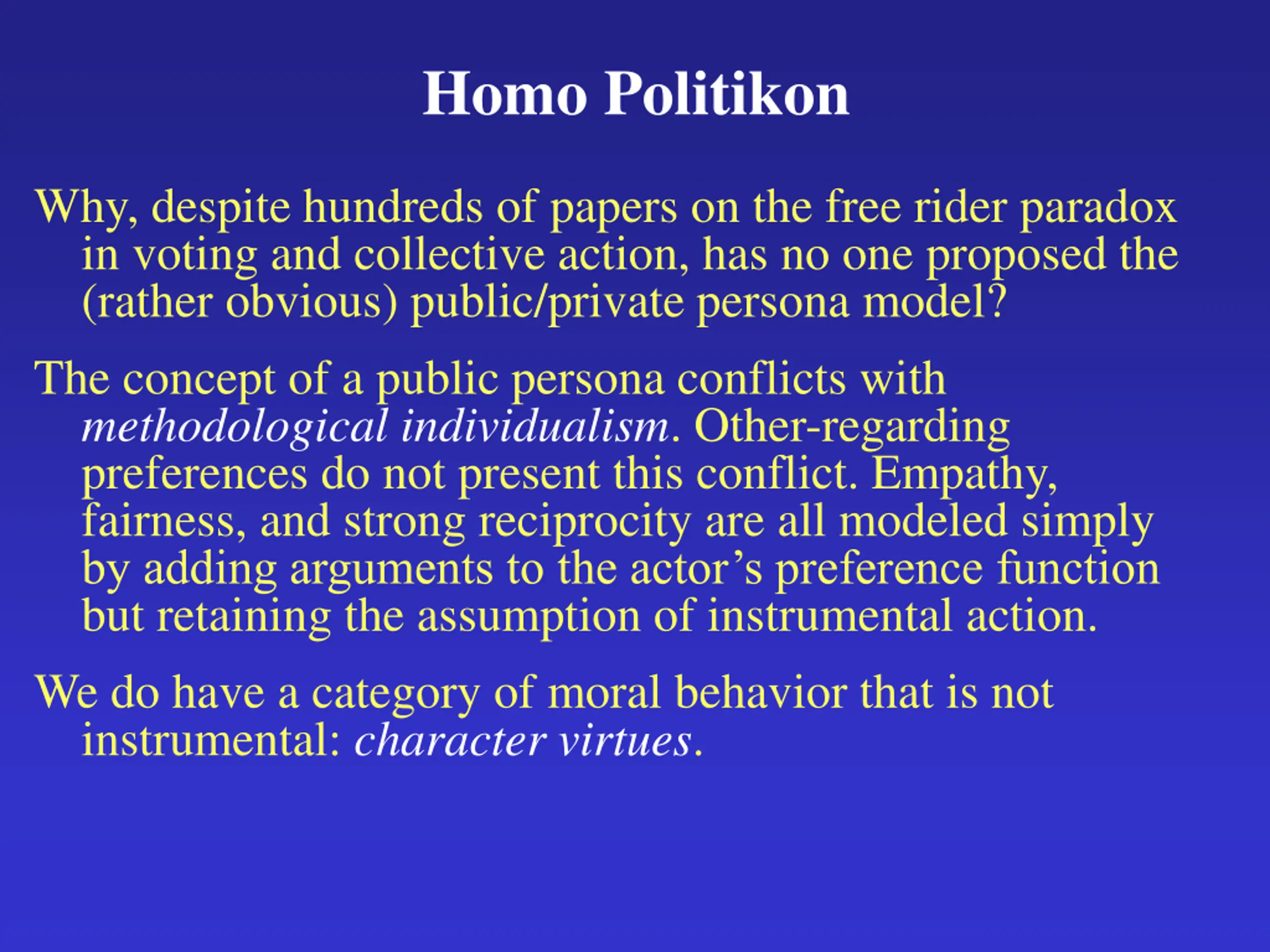 Homo Politikon Why, despite hundreds of papers on the free rider paradox in voting and collective action, has no one proposed the (rather obvious) public/private persona model? The concept of a public persona conflicts with methodological individualism. Other-regarding preferences do not present this conflict. Empathy, fairness, and strong reciprocity are all modeled simply by adding arguments to the actor s preference function but retaining the assumption of instrumental action. We do have a category of moral behavior that is not instrumental: character virtues.