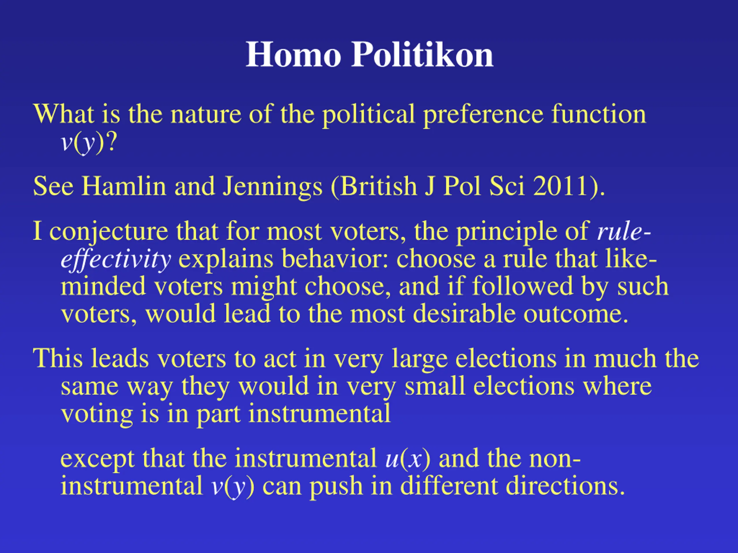 Homo Politikon What is the nature of the political preference function v(y)? See Hamlin and Jennings (British J Pol Sci 2011). I conjecture that for most voters, the principle of rule- effectivity explains behavior: choose a rule that like- minded voters might choose, and if followed by such voters, would lead to the most desirable outcome. This leads voters to act in very large elections in much the same way they would in very small elections where voting is in part instrumental except that the instrumental u(x) and the non- instrumental v(y) can push in different directions.