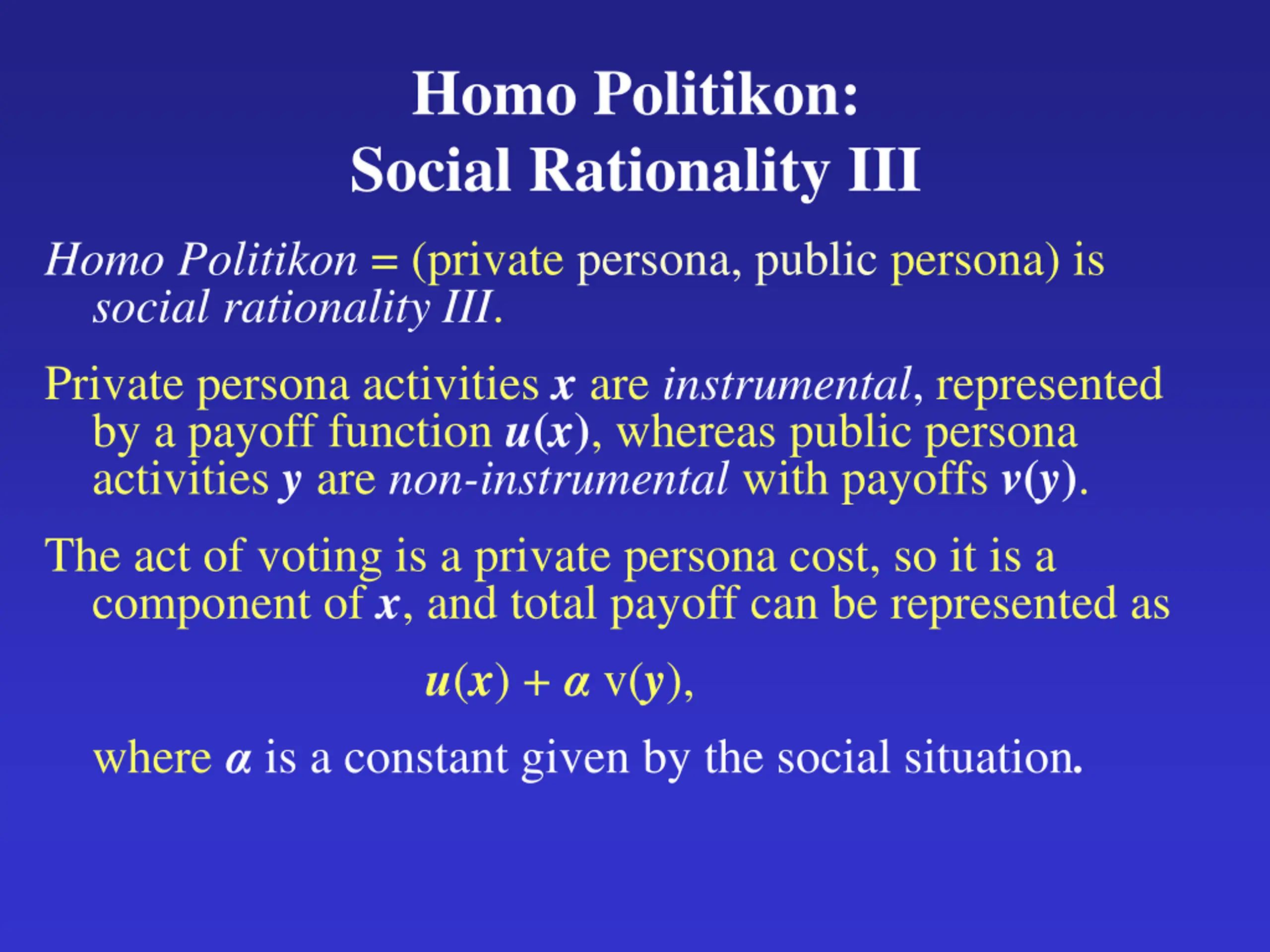 Homo Politikon: Social Rationality III Homo Politikon = (private persona, public persona) is social rationality III. Private persona activities x are instrumental, represented by a payoff function u(x), whereas public persona activities y are non-instrumental with payoffs v(y). The act of voting is a private persona cost, so it is a component of x, and total payoff can be represented as u(x) + v(y), where is a constant given by the social situation.