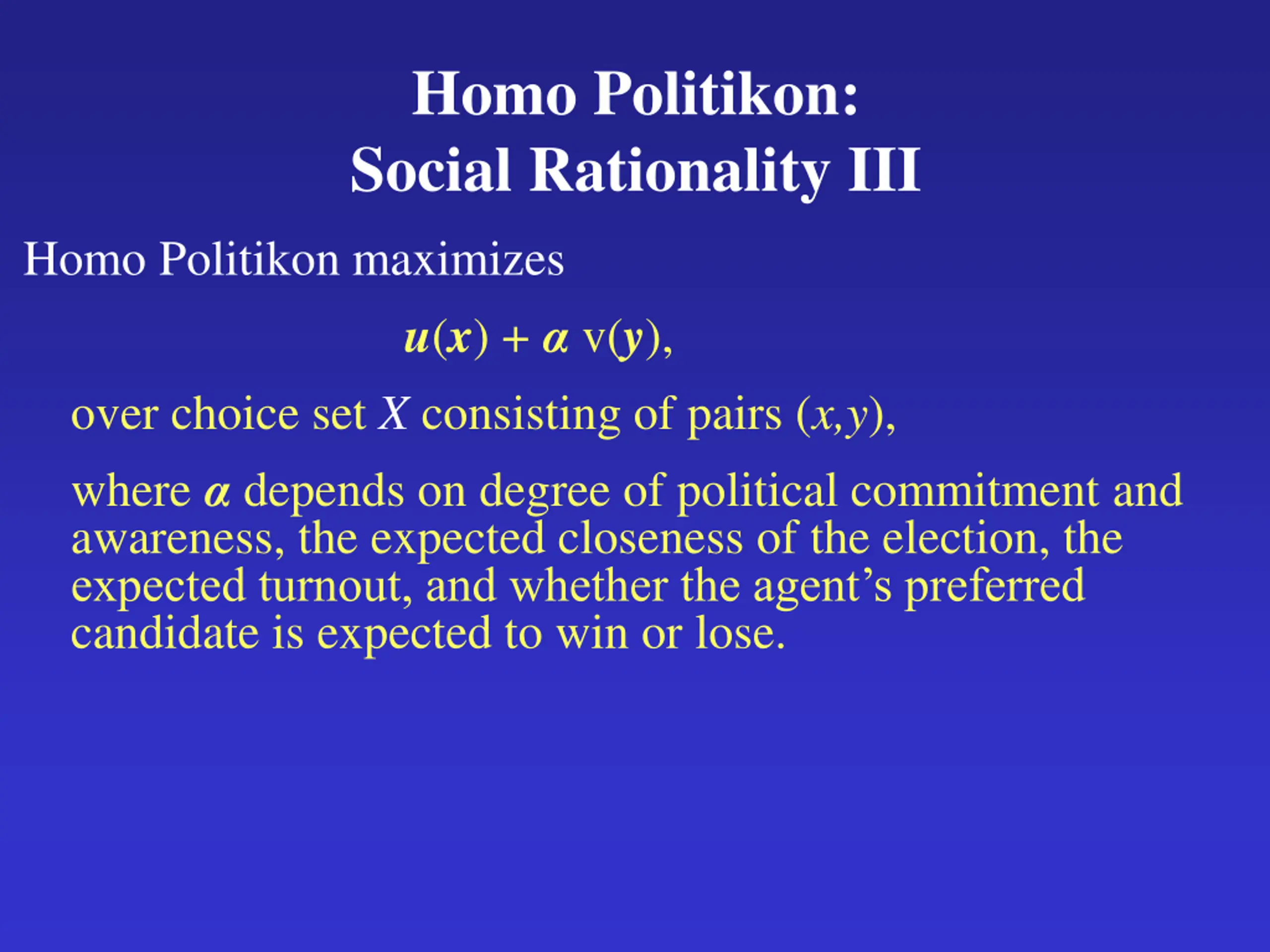 Homo Politikon: Social Rationality III Homo Politikon maximizes over choice set X consisting of pairs (x,y), where depends on degree of political commitment and awareness, the expected closeness of the election, the expected turnout, and whether the agent s preferred candidate is expected to win or lose. u(x) + v(y),