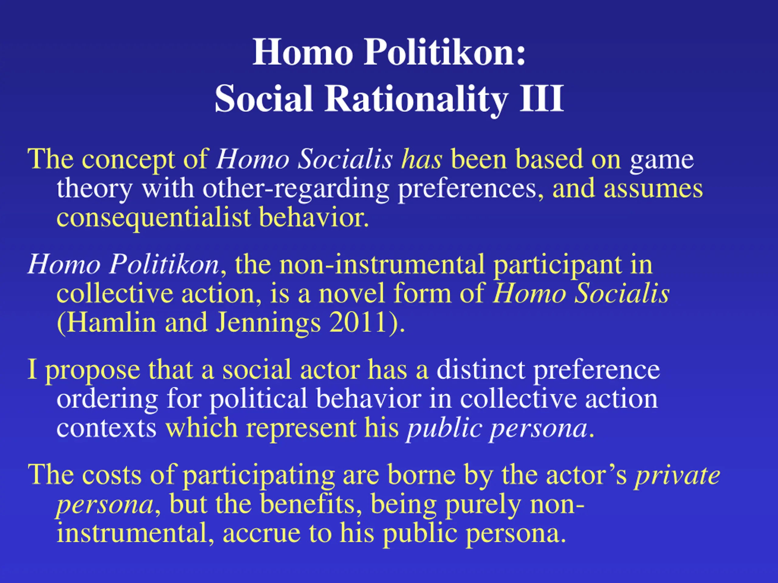 Homo Politikon: Social Rationality III The concept of Homo Socialis has been based on game theory with other-regarding preferences, and assumes consequentialist behavior. Homo Politikon, the non-instrumental participant in collective action, is a novel form of Homo Socialis (Hamlin and Jennings 2011). I propose that a social actor has a distinct preference ordering for political behavior in collective action contexts which represent his public persona. The costs of participating are borne by the actor s private persona, but the benefits, being purely non- instrumental, accrue to his public persona.