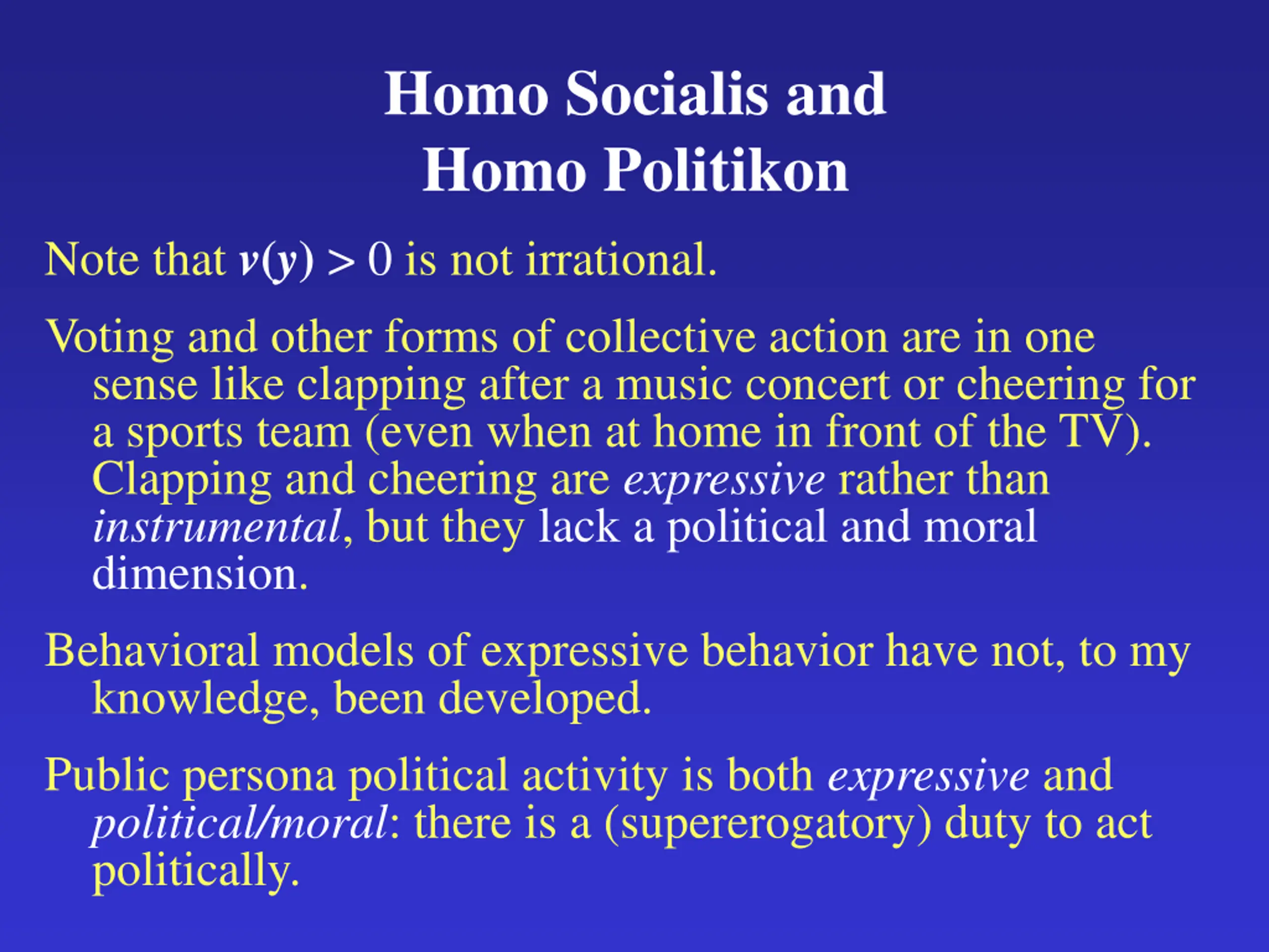 Homo Socialis and Homo Politikon Note that v(y) > 0 is not irrational. Voting and other forms of collective action are in one sense like clapping after a music concert or cheering for a sports team (even when at home in front of the TV). Clapping and cheering are expressive rather than instrumental, but they lack a political and moral dimension. Behavioral models of expressive behavior have not, to my knowledge, been developed. Public persona political activity is both expressive and political/moral: there is a (supererogatory) duty to act politically.
