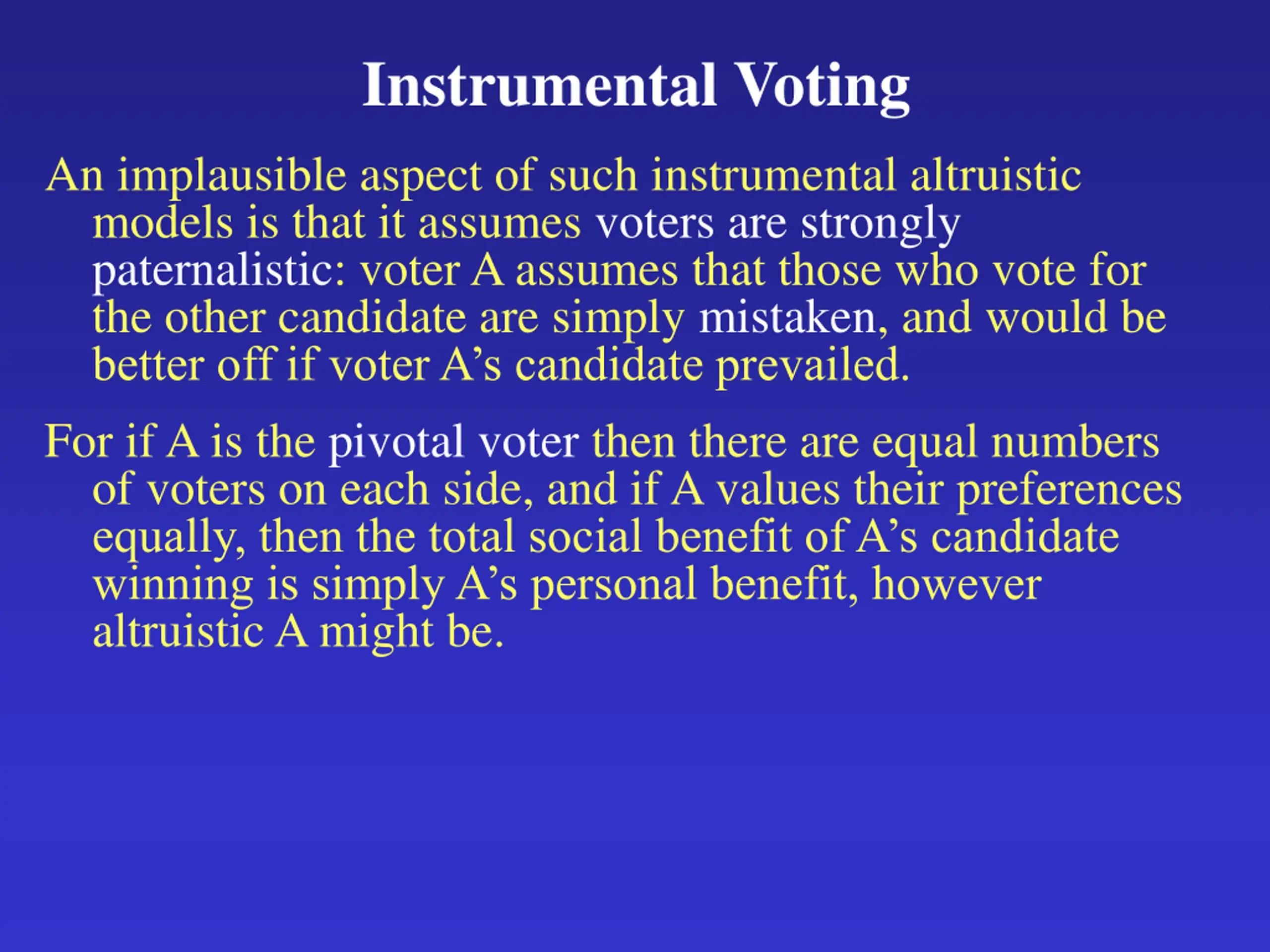 Instrumental Voting An implausible aspect of such instrumental altruistic models is that it assumes voters are strongly paternalistic: voter A assumes that those who vote for the other candidate are simply mistaken, and would be better off if voter A s candidate prevailed. For if A is the pivotal voter then there are equal numbers of voters on each side, and if A values their preferences equally, then the total social benefit of A s candidate winning is simply A s personal benefit, however altruistic A might be.