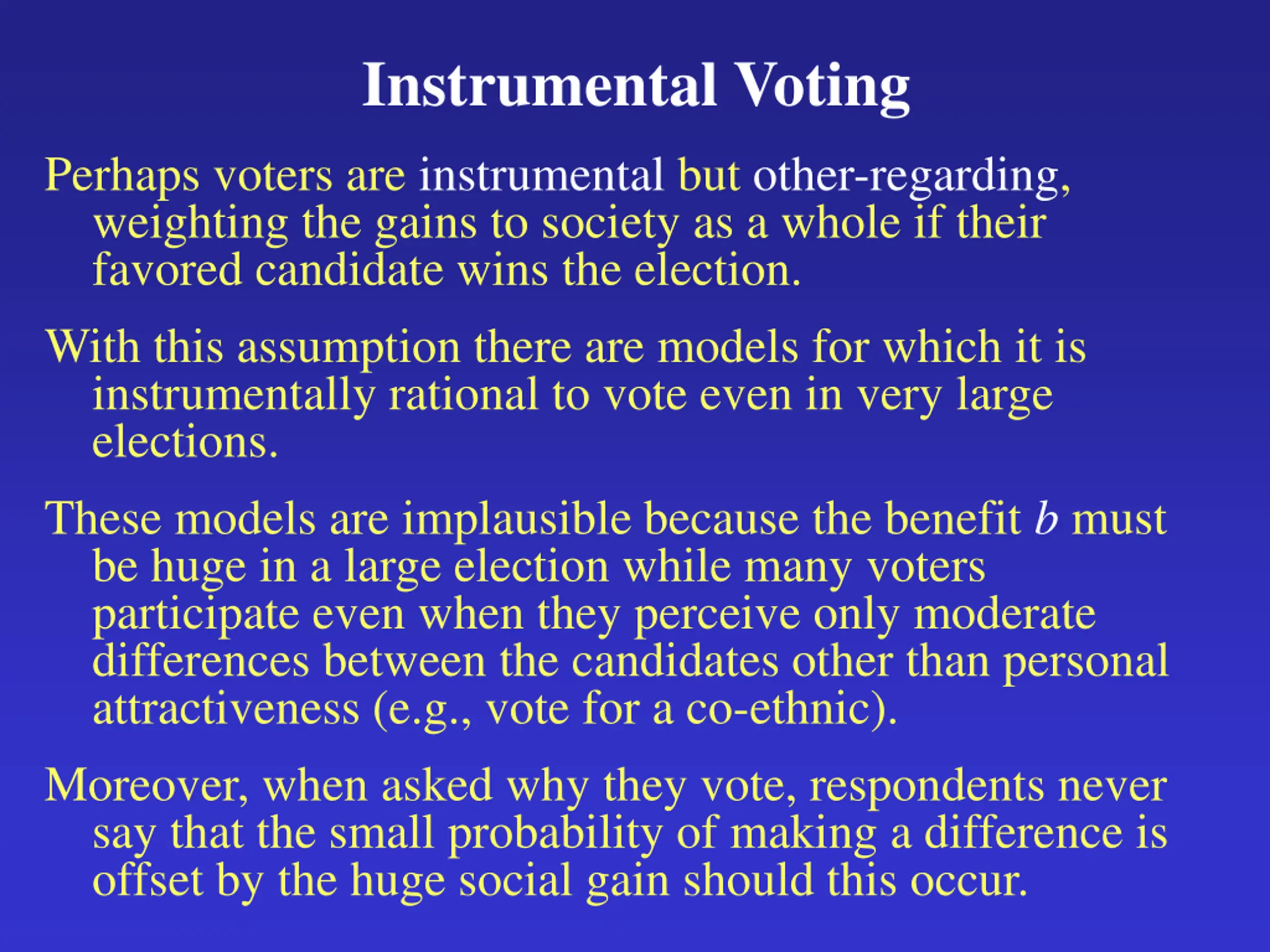 Instrumental Voting Perhaps voters are instrumental but other-regarding, weighting the gains to society as a whole if their favored candidate wins the election. With this assumption there are models for which it is instrumentally rational to vote even in very large elections. These models are implausible because the benefit b must be huge in a large election while many voters participate even when they perceive only moderate differences between the candidates other than personal attractiveness (e.g., vote for a co-ethnic). Moreover, when asked why they vote, respondents never say that the small probability of making a difference is offset by the huge social gain should this occur.