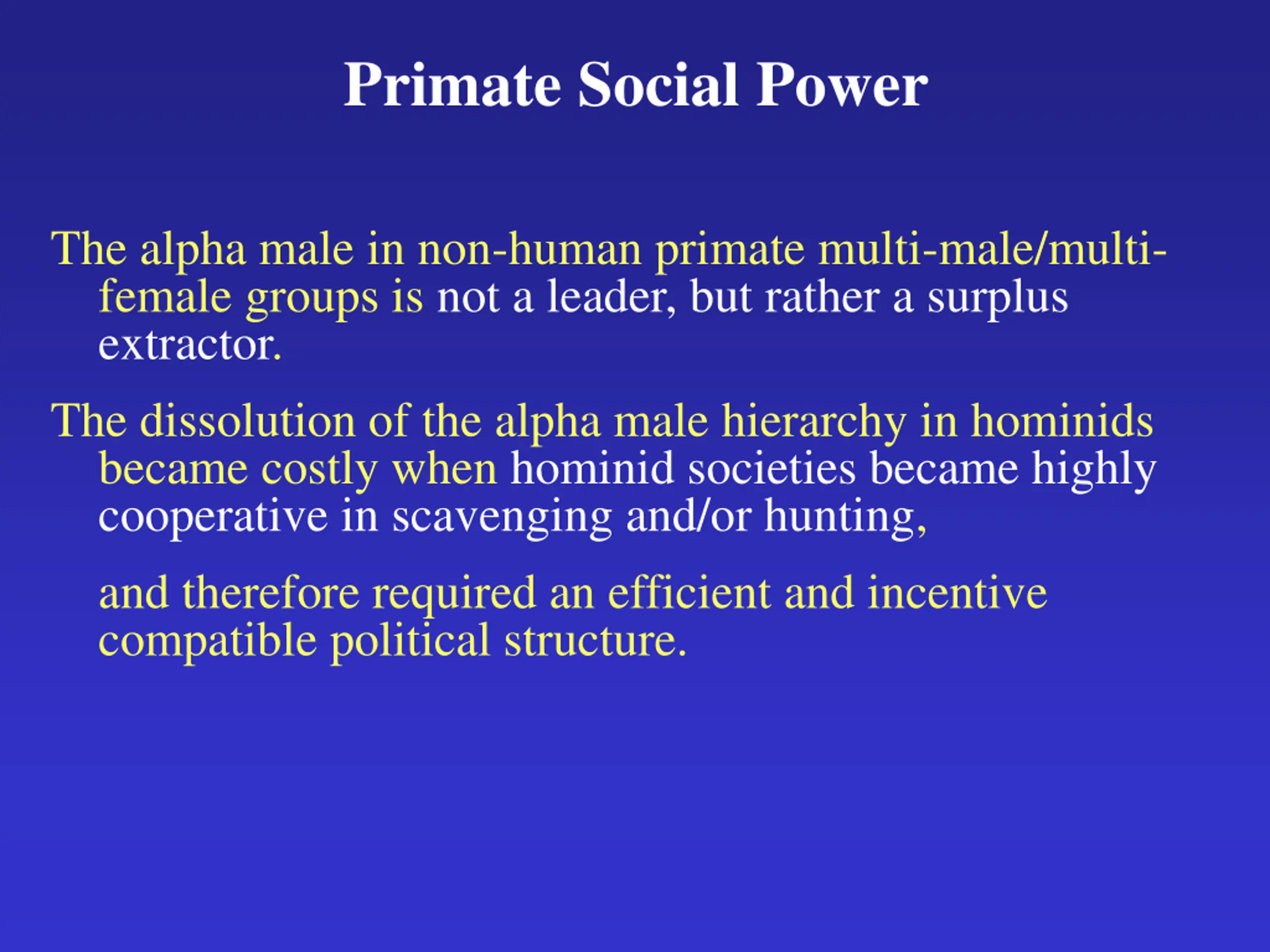 Primate Social Power The alpha male in non-human primate multi-male/multi- female groups is not a leader, but rather a surplus extractor. The dissolution of the alpha male hierarchy in hominids became costly when hominid societies became highly cooperative in scavenging and/or hunting, and therefore required an efficient and incentive compatible political structure.