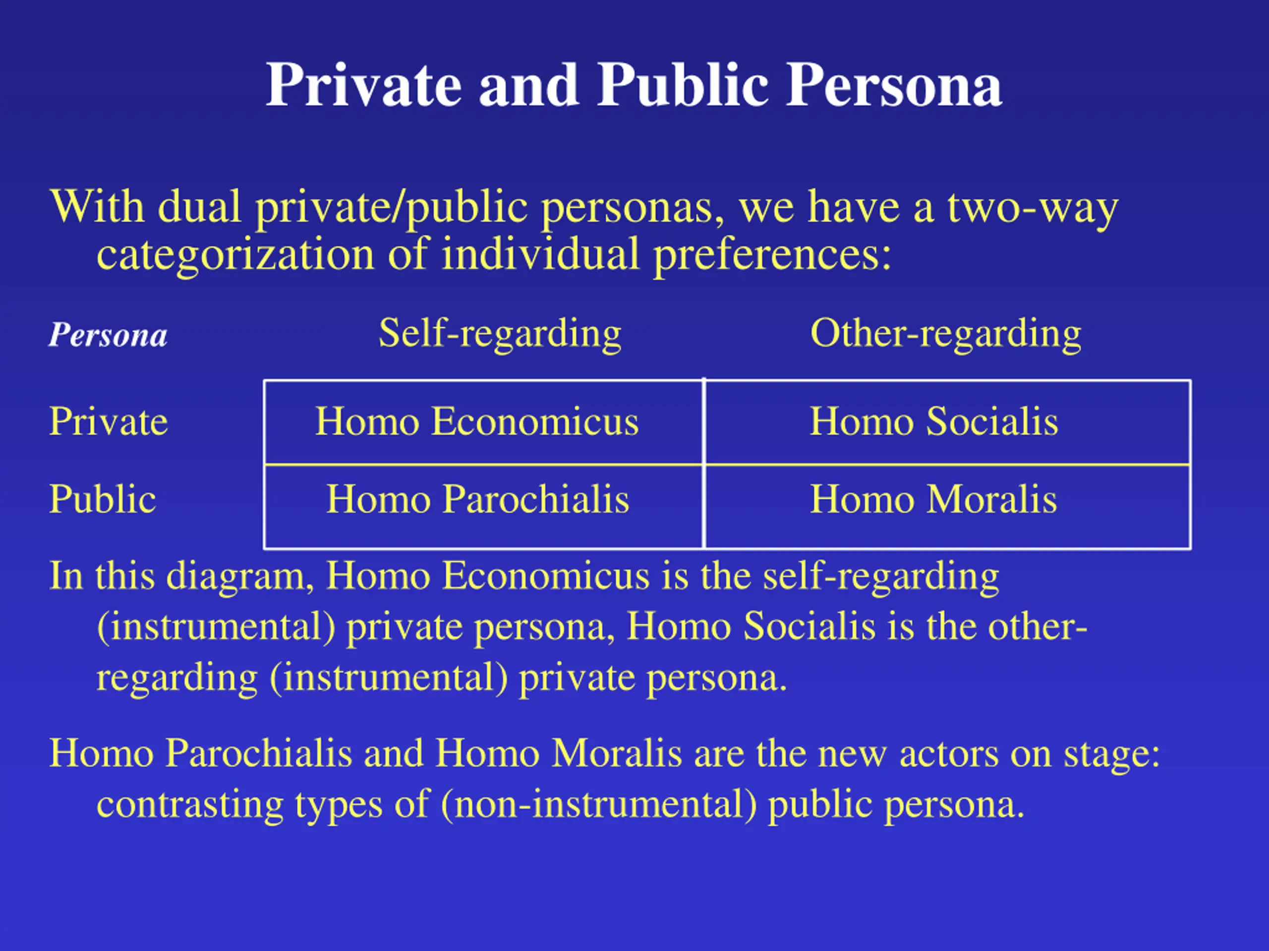 Private and Public Persona With dual private/public personas, we have a two-way categorization of individual preferences: PersonaSelf-regarding Other-regarding Private Homo Economicus Homo Socialis Public Homo Parochialis Homo Moralis In this diagram, Homo Economicus is the self-regarding (instrumental) private persona, Homo Socialis is the other- regarding (instrumental) private persona. Homo Parochialis and Homo Moralis are the new actors on stage: contrasting types of (non-instrumental) public persona.