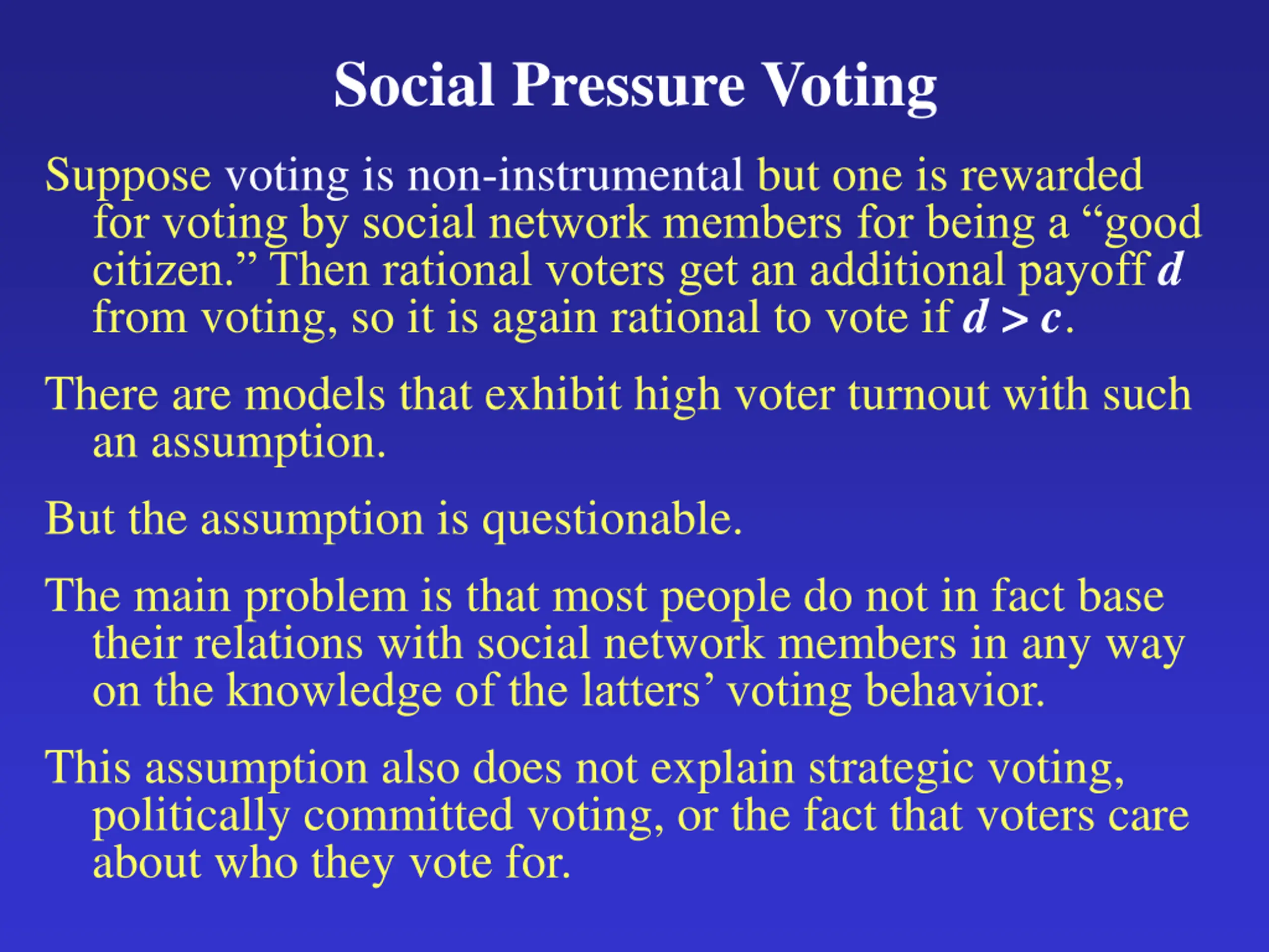 Social Pressure Voting Suppose voting is non-instrumental but one is rewarded for voting by social network members for being a good citizen. Then rational voters get an additional payoff d from voting, so it is again rational to vote if d > c. There are models that exhibit high voter turnout with such an assumption. But the assumption is questionable. The main problem is that most people do not in fact base their relations with social network members in any way on the knowledge of the latters voting behavior. This assumption also does not explain strategic voting, politically committed voting, or the fact that voters care about who they vote for.