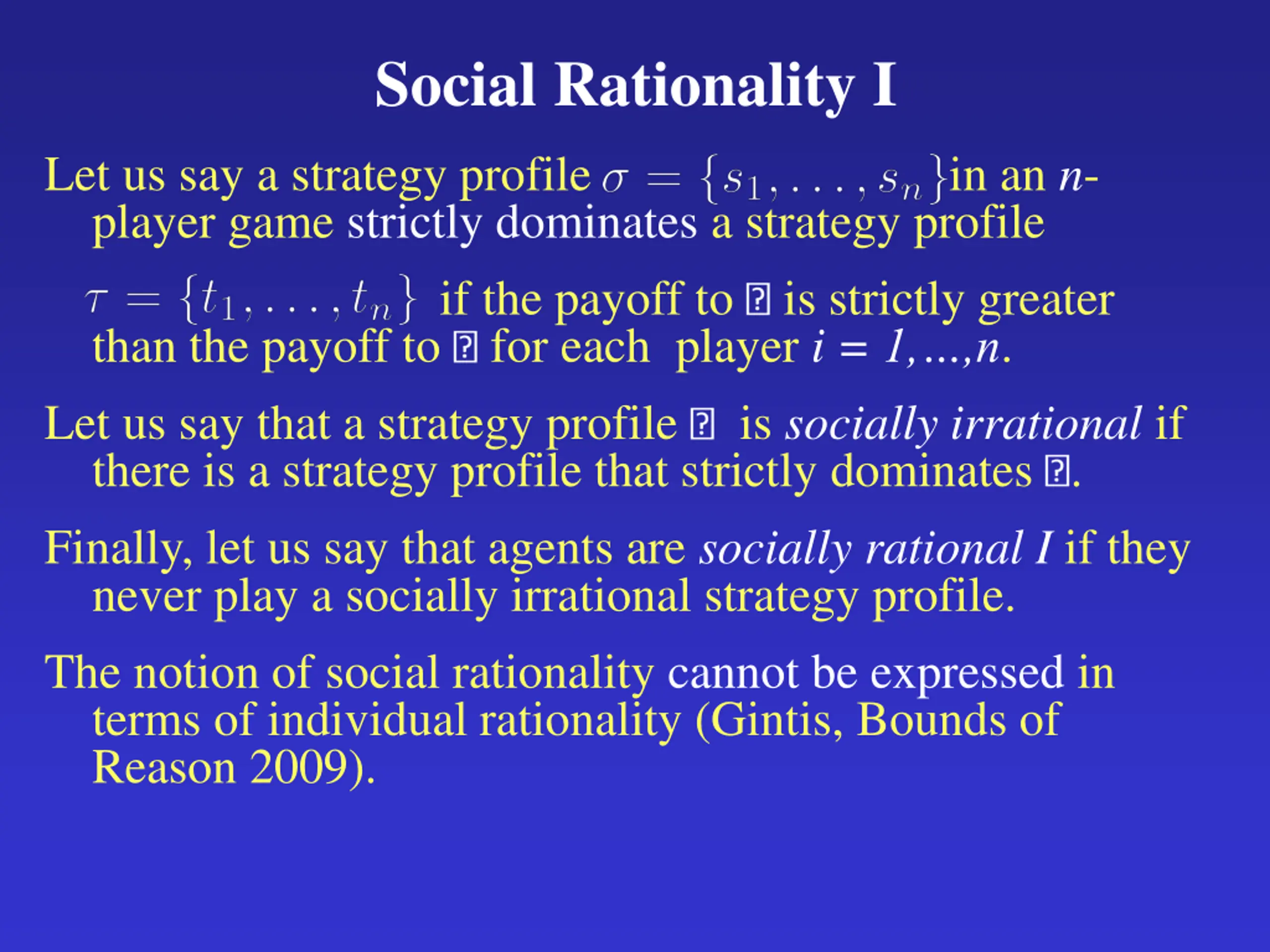 Social Rationality I Let us say a strategy profile player game strictly dominates a strategy profile if the payoff to is strictly greater than the payoff to for each player i = 1, ,n. Let us say that a strategy profile is socially irrational if there is a strategy profile that strictly dominates . Finally, let us say that agents are socially rational I if they never play a socially irrational strategy profile. The notion of social rationality cannot be expressed in terms of individual rationality (Gintis, Bounds of Reason 2009). in an n-