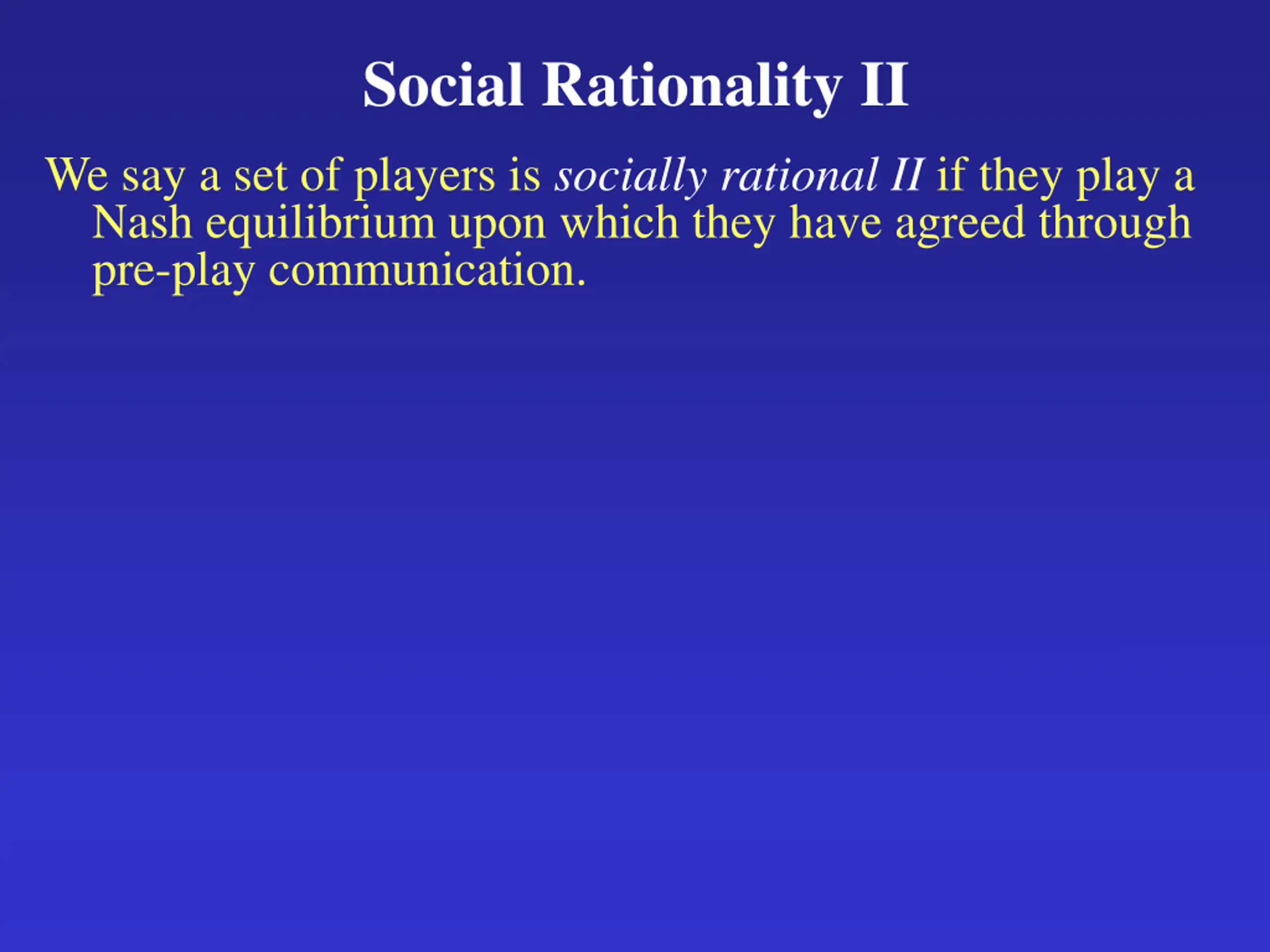 Social Rationality II We say a set of players is socially rational II if they play a Nash equilibrium upon which they have agreed through pre-play communication.