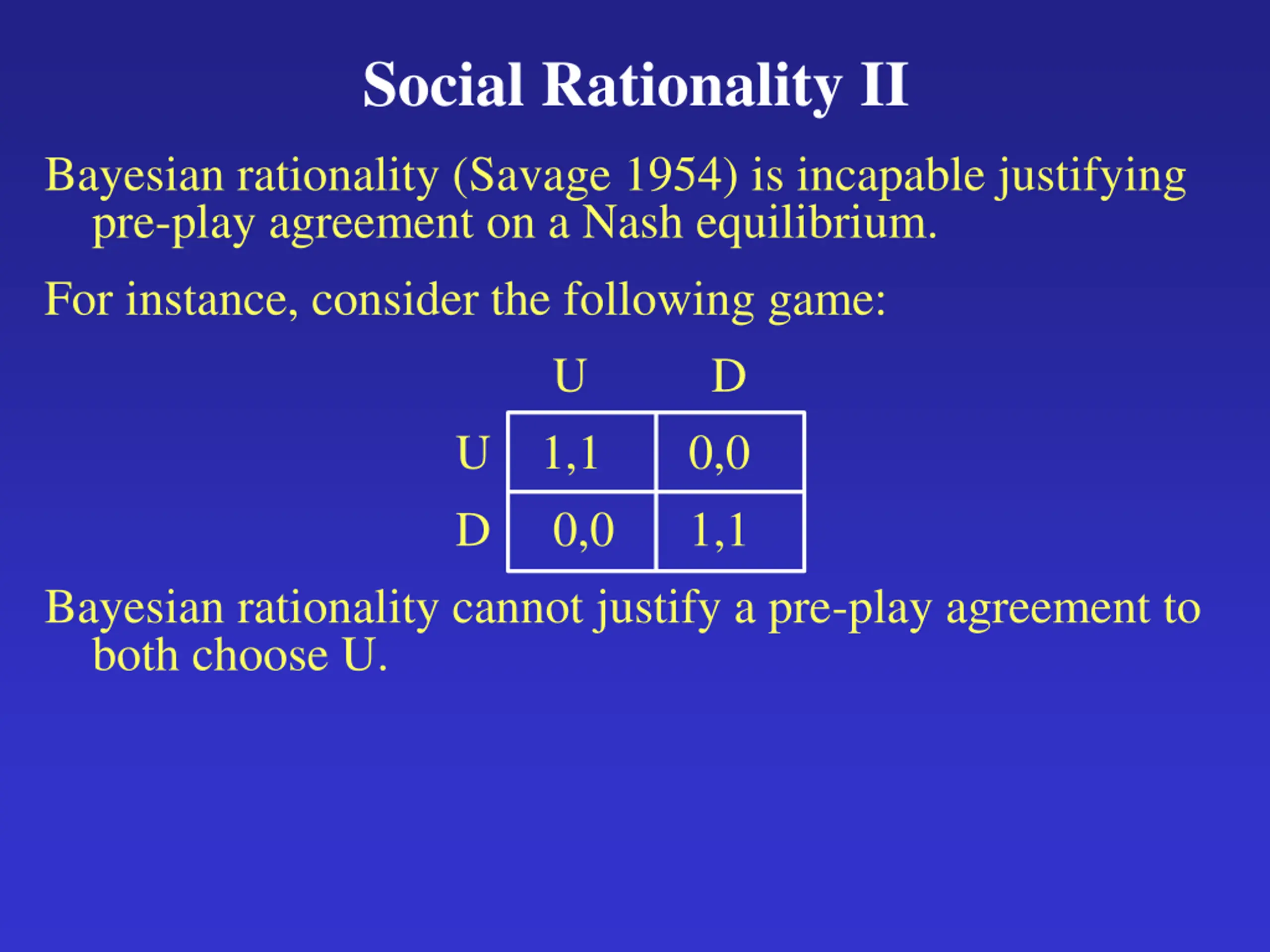 Social Rationality II Bayesian rationality (Savage 1954) is incapable justifying pre-play agreement on a Nash equilibrium. For instance, consider the following game: U D U 1,1 0,0 D 0,0 1,1 Bayesian rationality cannot justify a pre-play agreement to both choose U.