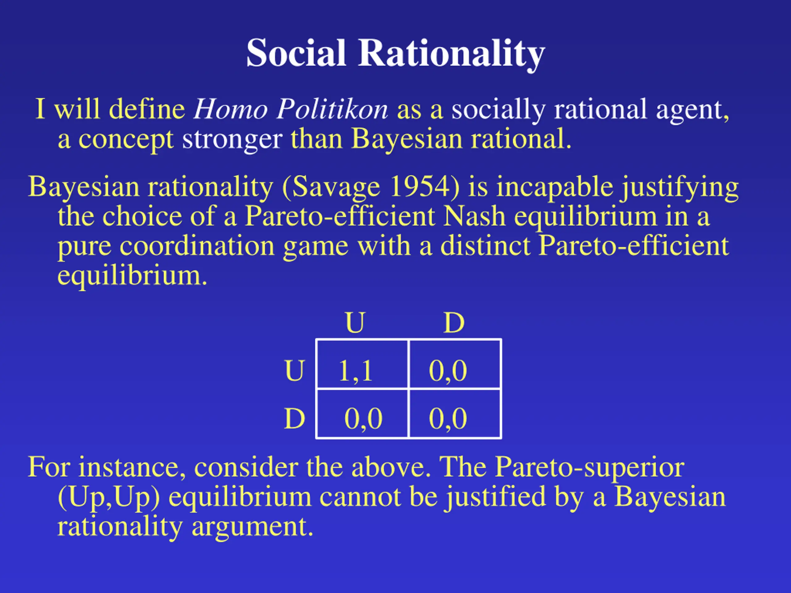 Social Rationality I will define Homo Politikon as a socially rational agent, a concept stronger than Bayesian rational. Bayesian rationality (Savage 1954) is incapable justifying the choice of a Pareto-efficient Nash equilibrium in a pure coordination game with a distinct Pareto-efficient equilibrium. U D U 1,1 0,0 D 0,0 0,0 For instance, consider the above. The Pareto-superior (Up,Up) equilibrium cannot be justified by a Bayesian rationality argument.