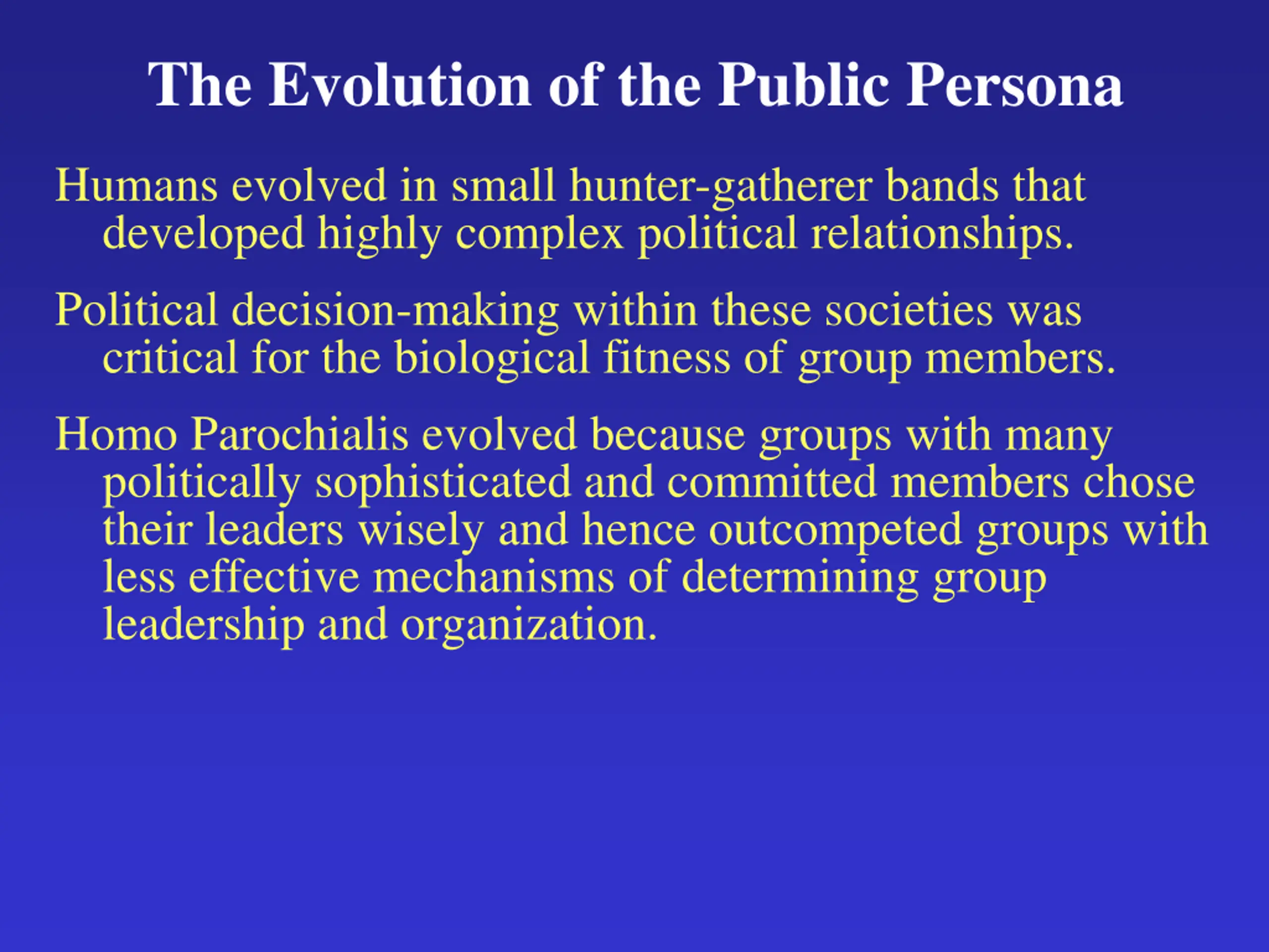 The Evolution of the Public Persona Humans evolved in small hunter-gatherer bands that developed highly complex political relationships. Political decision-making within these societies was critical for the biological fitness of group members. Homo Parochialis evolved because groups with many politically sophisticated and committed members chose their leaders wisely and hence outcompeted groups with less effective mechanisms of determining group leadership and organization.