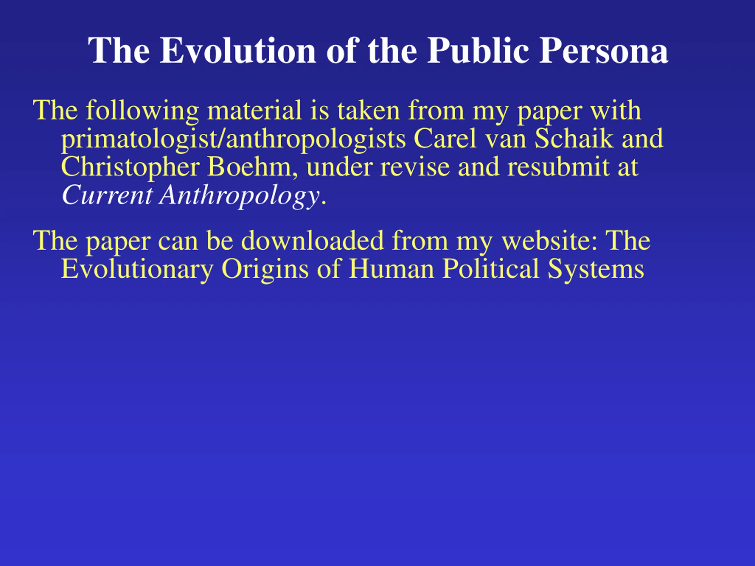 The Evolution of the Public Persona The following material is taken from my paper with primatologist/anthropologists Carel van Schaik and Christopher Boehm, under revise and resubmit at Current Anthropology. The paper can be downloaded from my website: The Evolutionary Origins of Human Political Systems