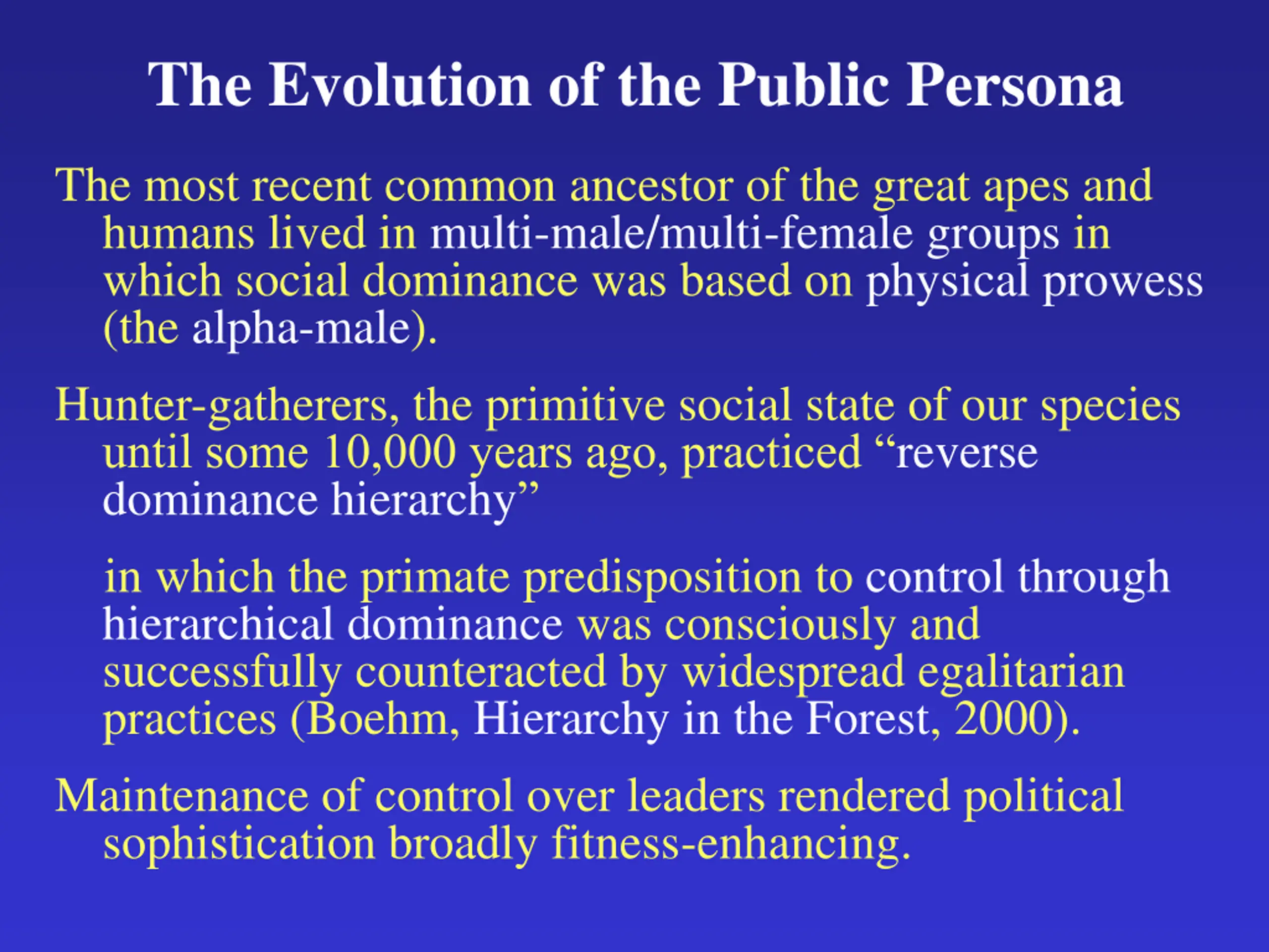 The Evolution of the Public Persona The most recent common ancestor of the great apes and humans lived in multi-male/multi-female groups in which social dominance was based on physical prowess (the alpha-male). Hunter-gatherers, the primitive social state of our species until some 10,000 years ago, practiced reverse dominance hierarchy in which the primate predisposition to control through hierarchical dominance was consciously and successfully counteracted by widespread egalitarian practices (Boehm, Hierarchy in the Forest, 2000). Maintenance of control over leaders rendered political sophistication broadly fitness-enhancing.