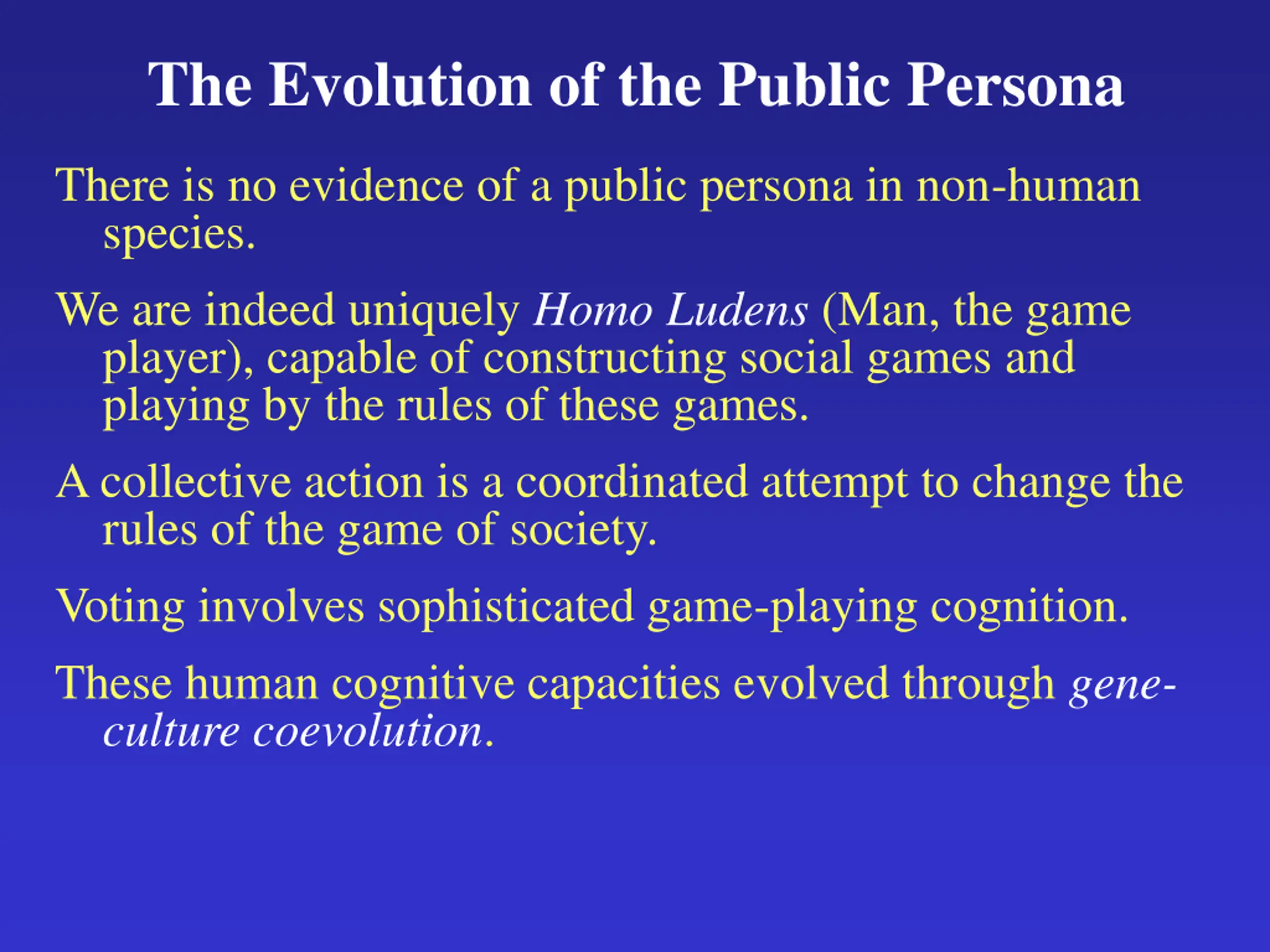 The Evolution of the Public Persona There is no evidence of a public persona in non-human species. We are indeed uniquely Homo Ludens (Man, the game player), capable of constructing social games and playing by the rules of these games. A collective action is a coordinated attempt to change the rules of the game of society. Voting involves sophisticated game-playing cognition. These human cognitive capacities evolved through gene- culture coevolution.