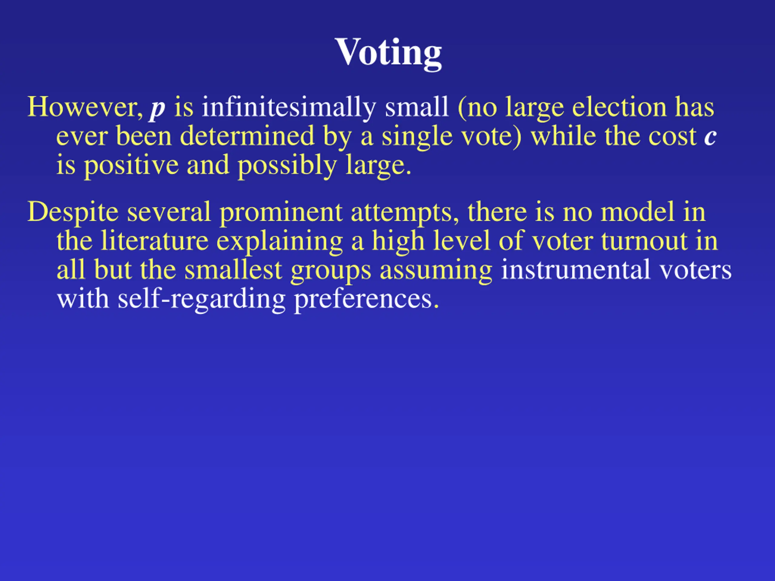 Voting However, p is infinitesimally small (no large election has ever been determined by a single vote) while the cost c is positive and possibly large. Despite several prominent attempts, there is no model in the literature explaining a high level of voter turnout in all but the smallest groups assuming instrumental voters with self-regarding preferences.