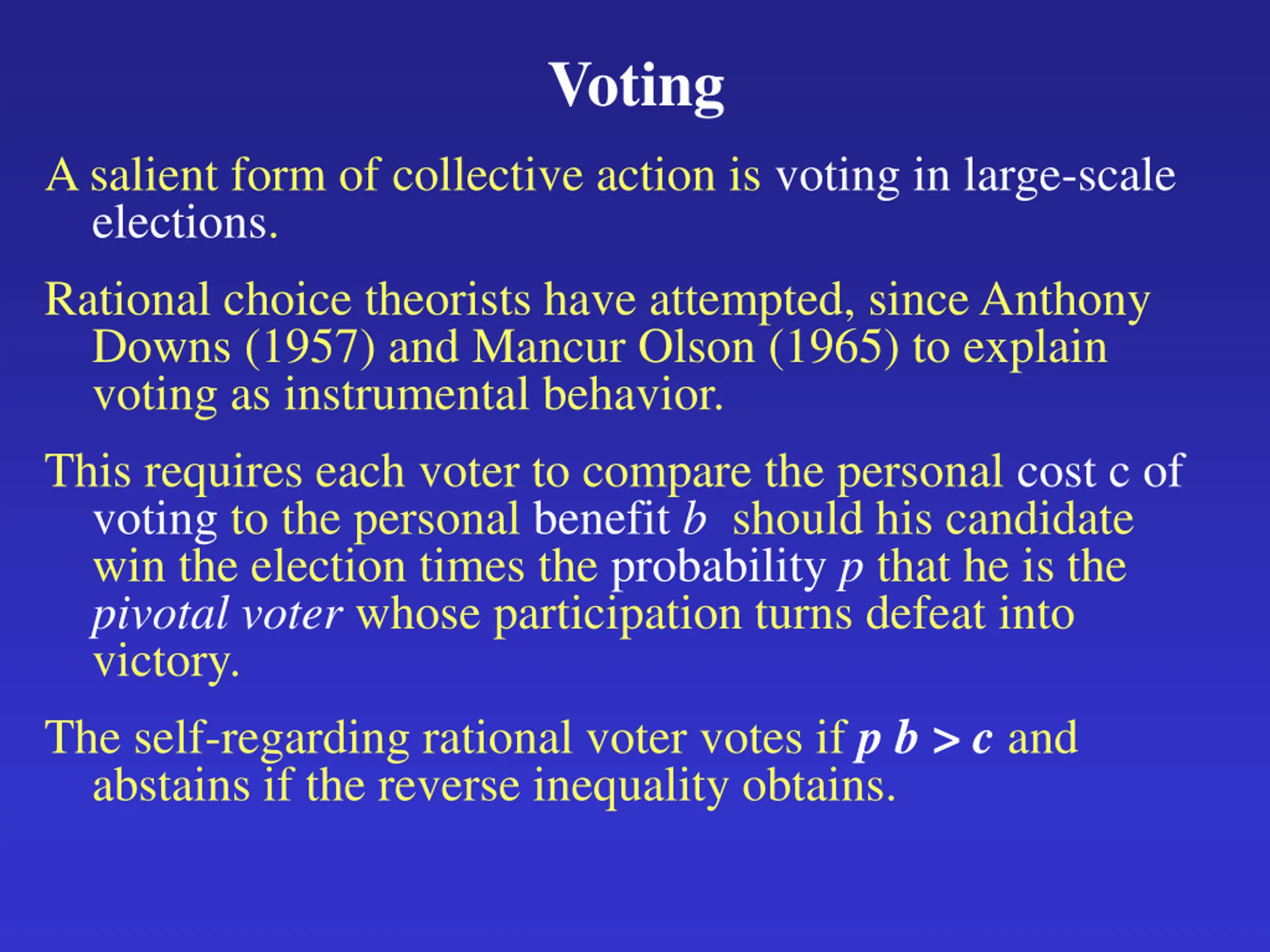 Voting A salient form of collective action is voting in large-scale elections. Rational choice theorists have attempted, since Anthony Downs (1957) and Mancur Olson (1965) to explain voting as instrumental behavior. This requires each voter to compare the personal cost c of voting to the personal benefit b should his candidate win the election times the probability p that he is the pivotal voter whose participation turns defeat into victory. The self-regarding rational voter votes if p b > cand abstains if the reverse inequality obtains.