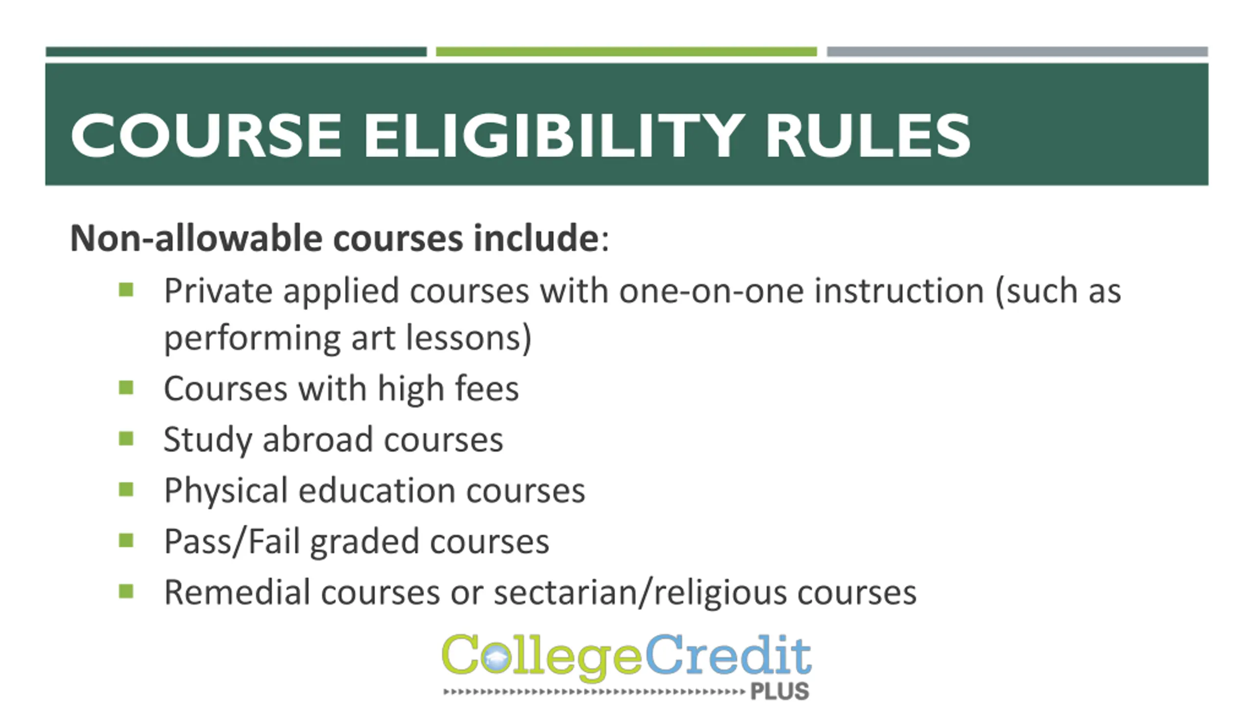 COURSE ELIGIBILITY RULES Non-allowable courses include: Private applied courses with one-on-one instruction (such as performing art lessons) Courses with high fees Study abroad courses Physical education courses Pass/Fail graded courses Remedial courses or sectarian/religious courses