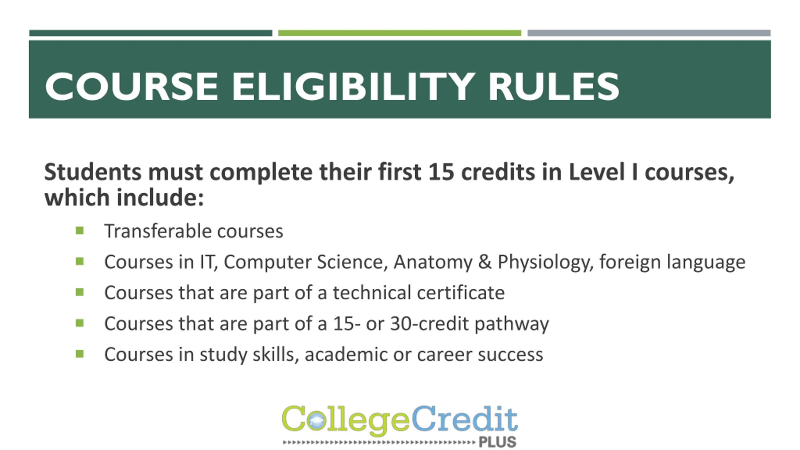 COURSE ELIGIBILITY RULES Students must complete their first 15 credits in Level I courses, which include: Transferable courses Courses in IT, Computer Science, Anatomy & Physiology, foreign language Courses that are part of a technical certificate Courses that are part of a 15- or 30-credit pathway Courses in study skills, academic or career success