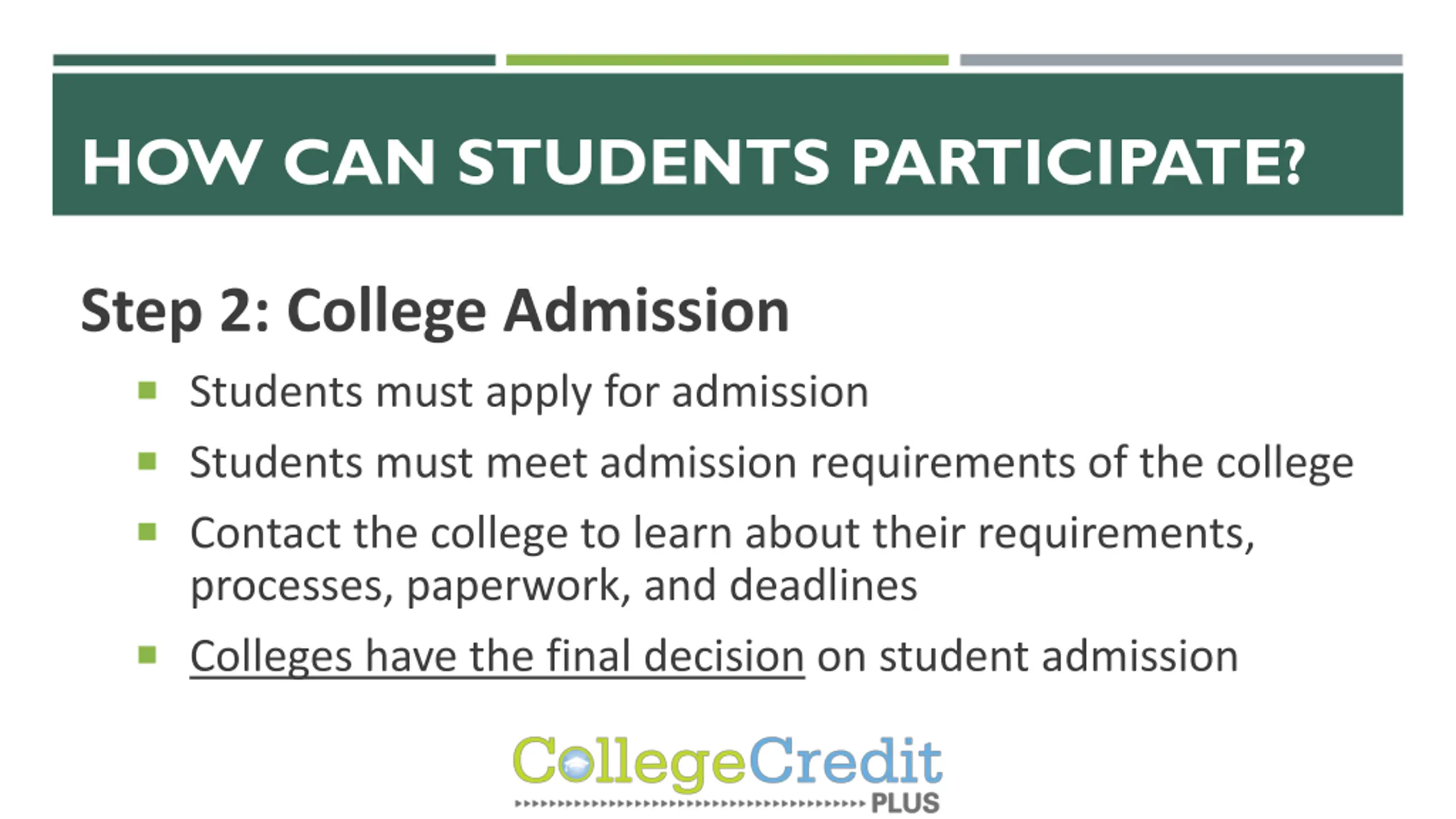 HOW CAN STUDENTS PARTICIPATE? Step 2: College Admission Students must apply for admission Students must meet admission requirements of the college Contact the college to learn about their requirements, processes, paperwork, and deadlines Colleges have the final decision on student admission