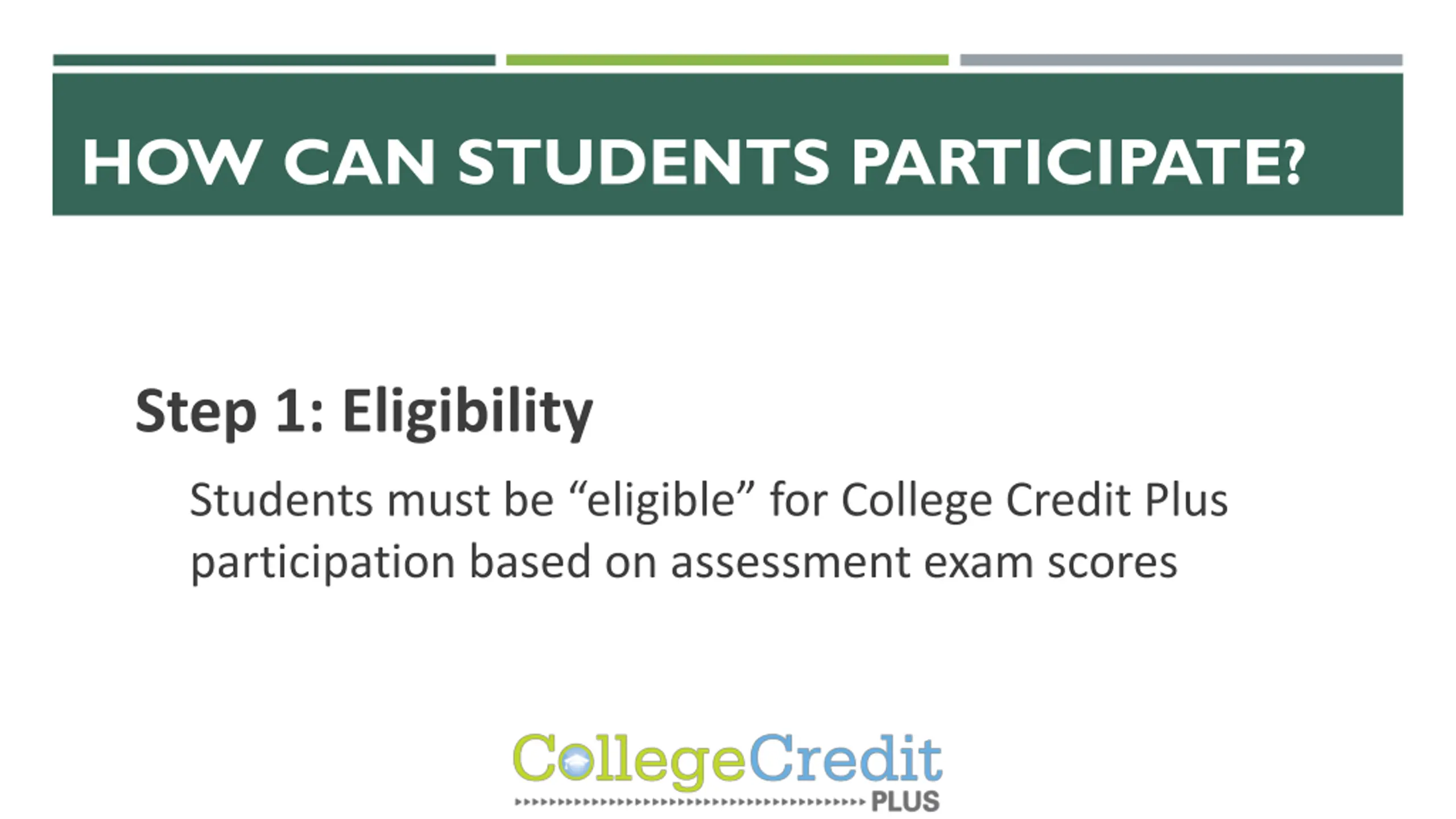 HOW CAN STUDENTS PARTICIPATE? Step 1: Eligibility Students must be eligible for College Credit Plus participation based on assessment exam scores