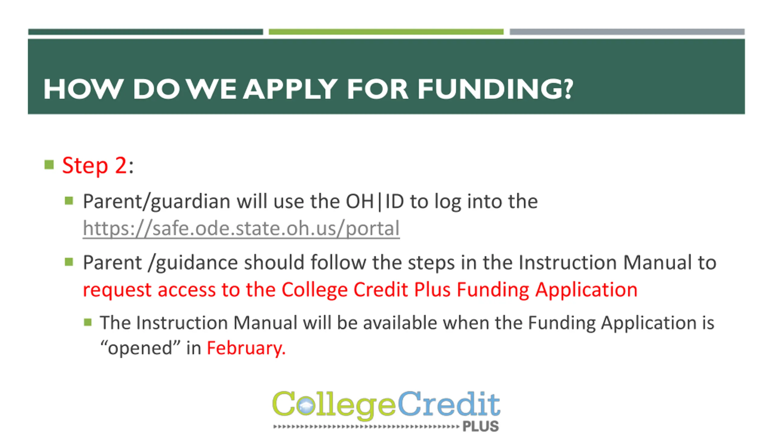 HOW DO WE APPLY FOR FUNDING? Step 2: Parent/guardian will use the OH|ID to log into the https://safe.ode.state.oh.us/portal Parent /guidance should follow the steps in the Instruction Manual to request access to the College Credit Plus Funding Application The Instruction Manual will be available when the Funding Application is opened in February.