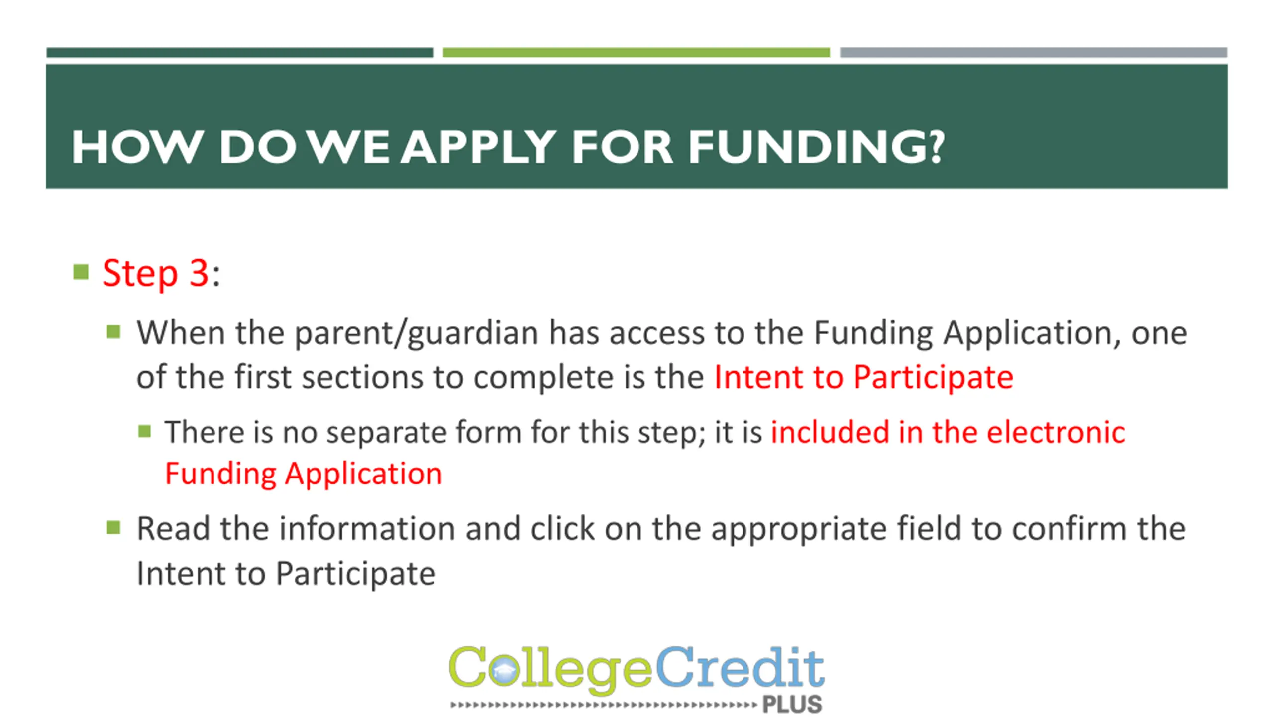 HOW DO WE APPLY FOR FUNDING? Step 3: When the parent/guardian has access to the Funding Application, one of the first sections to complete is the Intent to Participate There is no separate form for this step; it is included in the electronic Funding Application Read the information and click on the appropriate field to confirm the Intent to Participate
