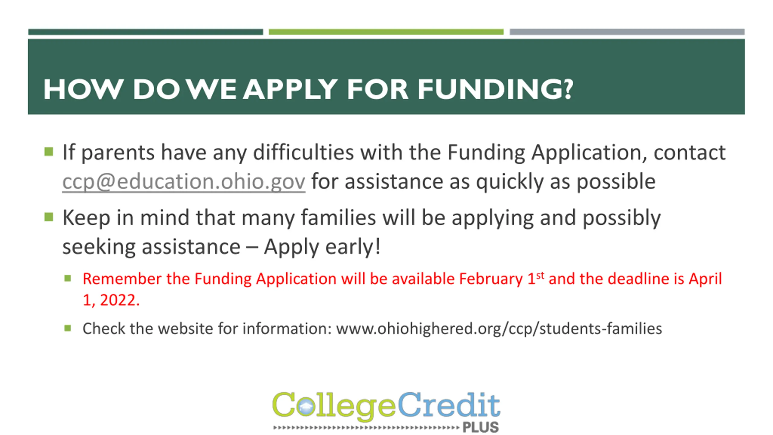 HOW DO WE APPLY FOR FUNDING? If parents have any difficulties with the Funding Application, contact ccp@education.ohio.gov for assistance as quickly as possible Keep in mind that many families will be applying and possibly seeking assistance Apply early! Remember the Funding Application will be available February 1stand the deadline is April 1, 2022. Check the website for information: www.ohiohighered.org/ccp/students-families
