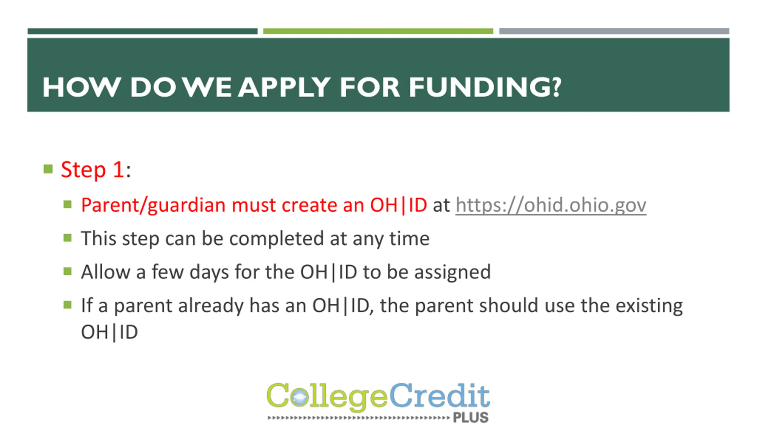 HOW DO WE APPLY FOR FUNDING? Step 1: Parent/guardian must create an OH|ID at https://ohid.ohio.gov This step can be completed at any time Allow a few days for the OH|ID to be assigned If a parent already has an OH|ID, the parent should use the existing OH|ID