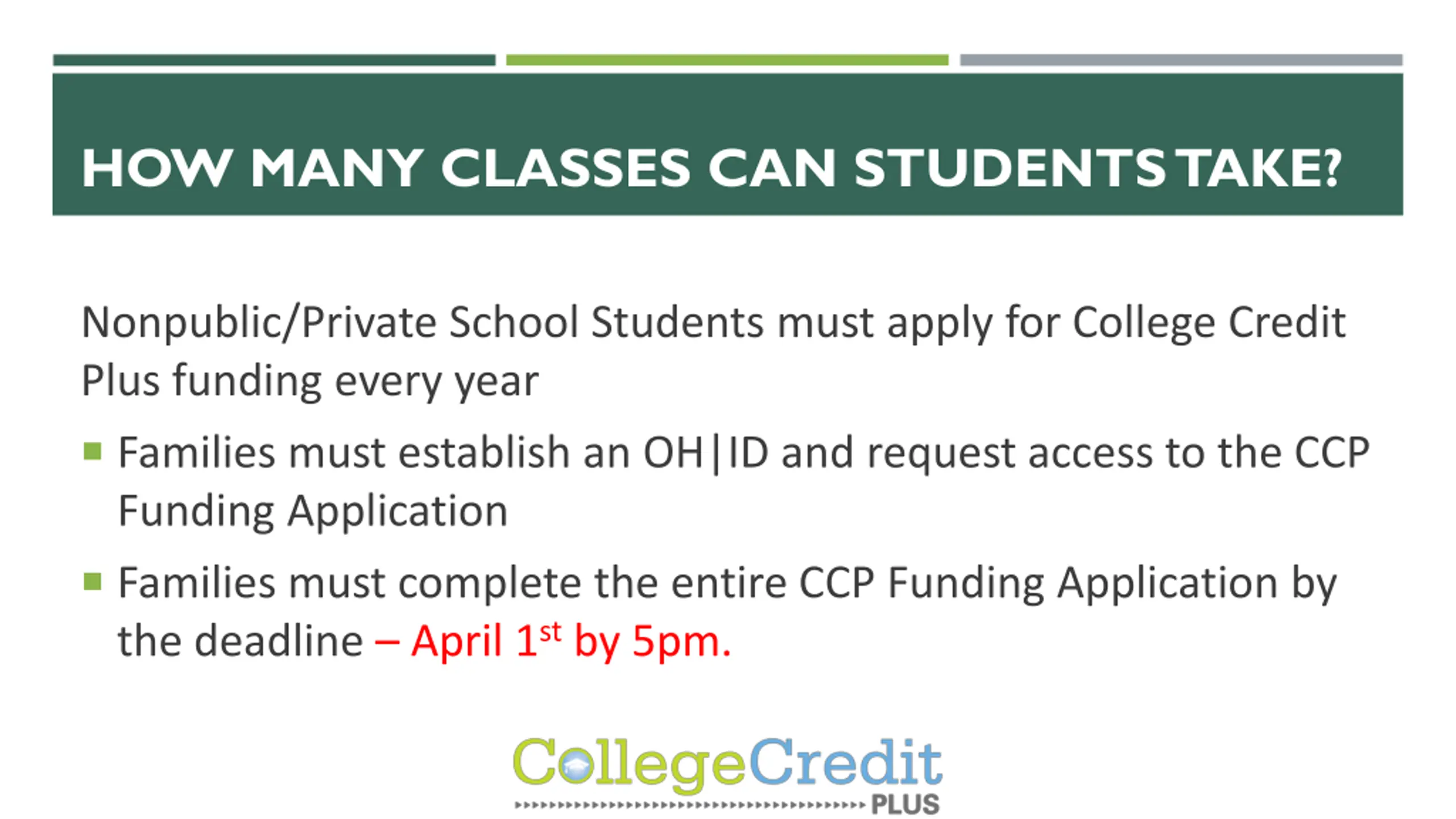 HOW MANY CLASSES CAN STUDENTS TAKE? Nonpublic/Private School Students must apply for College Credit Plus funding every year Families must establish an OH|ID and request access to the CCP Funding Application Families must complete the entire CCP Funding Application by the deadline April 1stby 5pm.