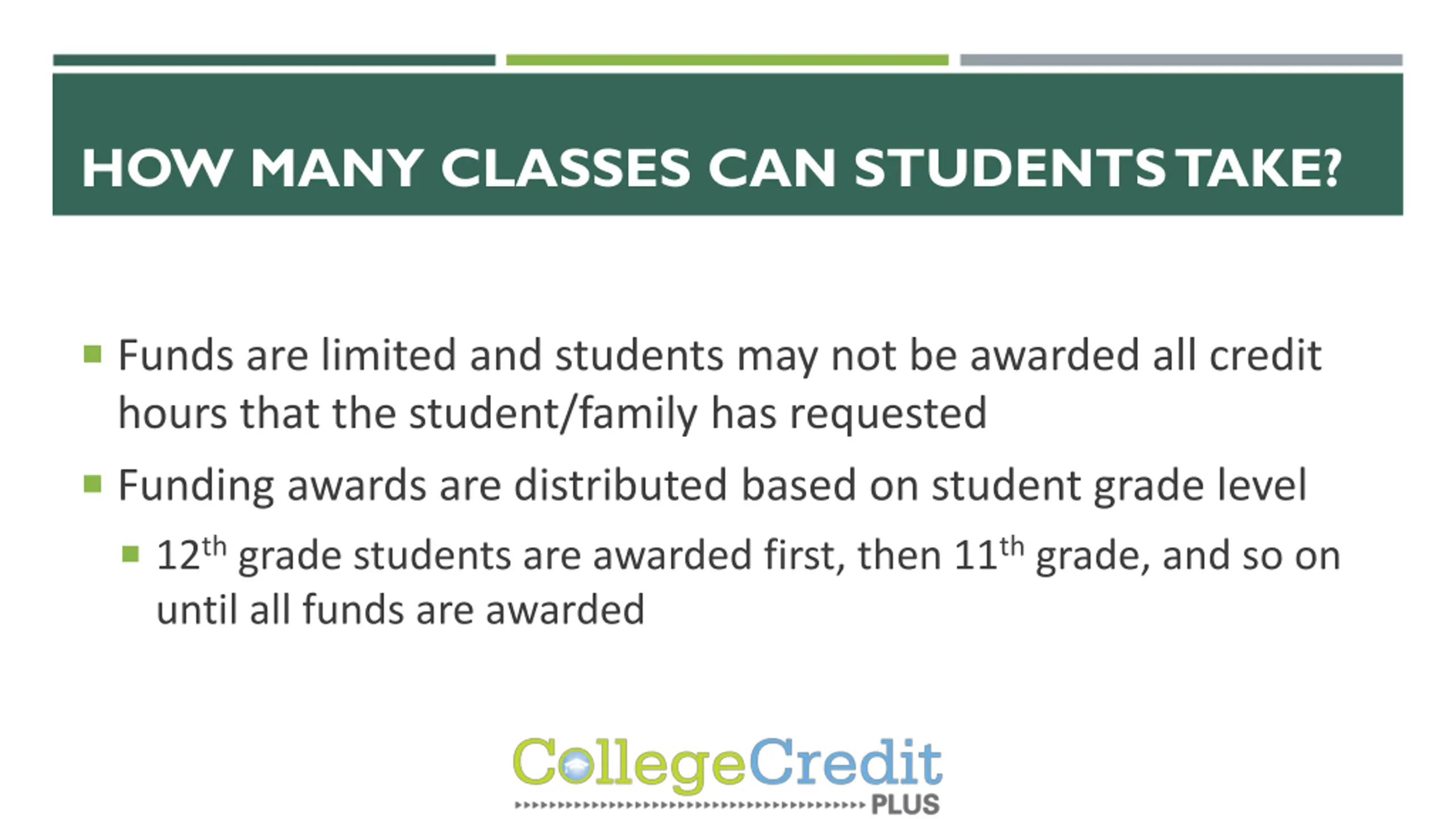 HOW MANY CLASSES CAN STUDENTS TAKE? Funds are limited and students may not be awarded all credit hours that the student/family has requested Funding awards are distributed based on student grade level 12thgrade students are awarded first, then 11thgrade, and so on until all funds are awarded