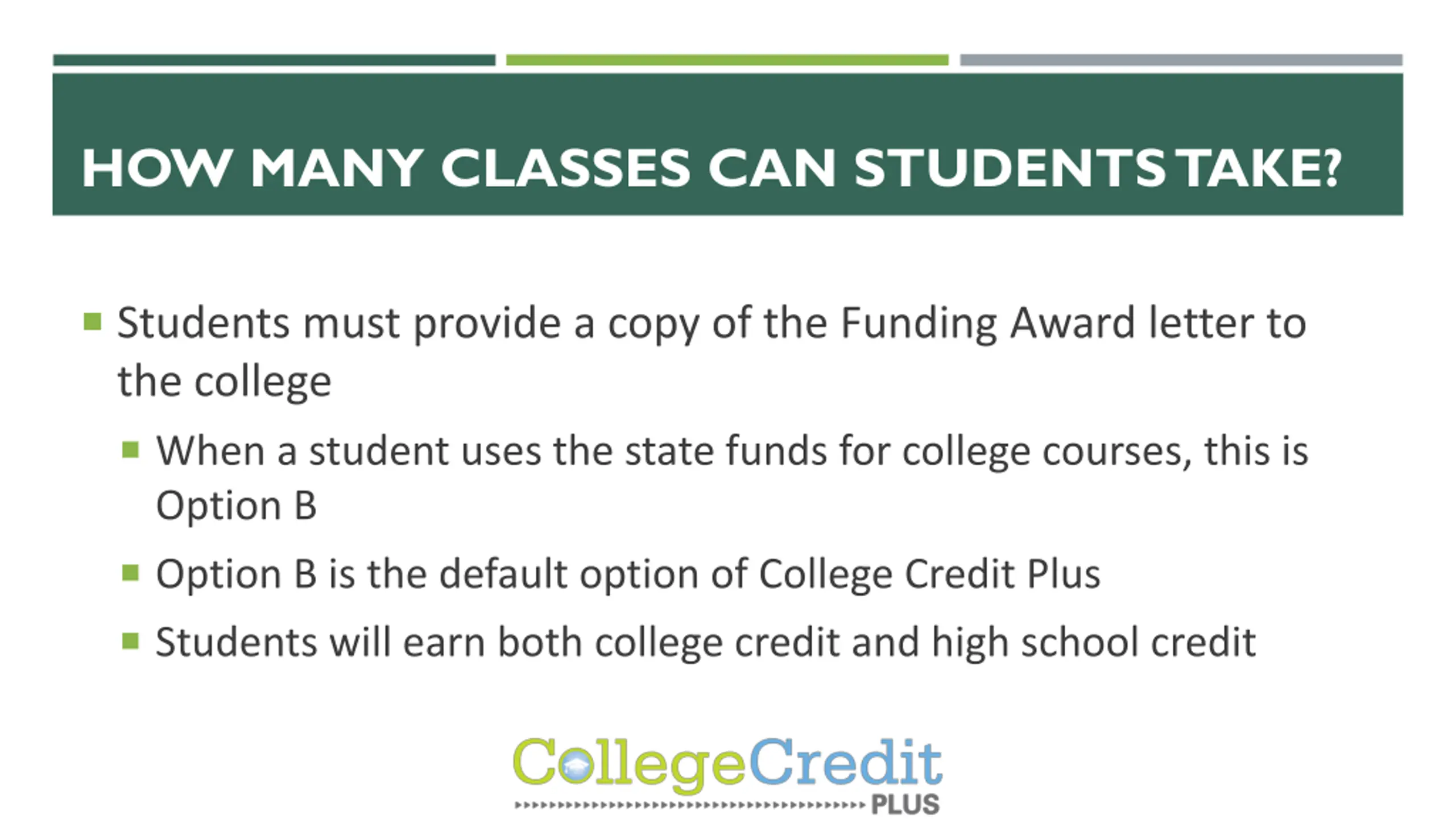 HOW MANY CLASSES CAN STUDENTS TAKE? Students must provide a copy of the Funding Award letter to the college When a student uses the state funds for college courses, this is Option B Option B is the default option of College Credit Plus Students will earn both college credit and high school credit