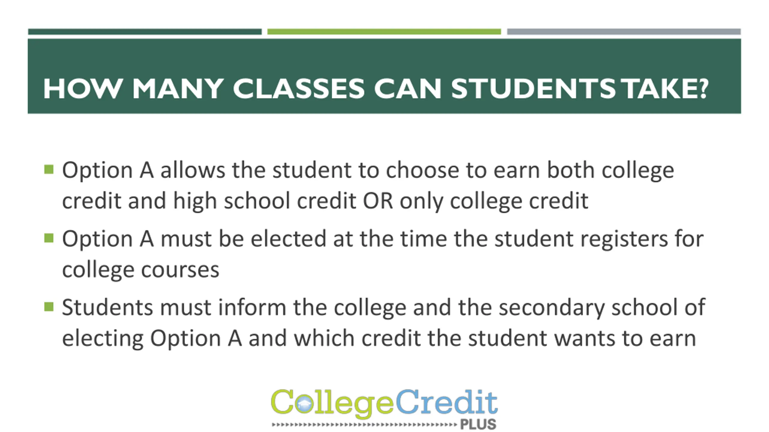 HOW MANY CLASSES CAN STUDENTS TAKE? Option A allows the student to choose to earn both college credit and high school credit OR only college credit Option A must be elected at the time the student registers for college courses Students must inform the college and the secondary school of electing Option A and which credit the student wants to earn