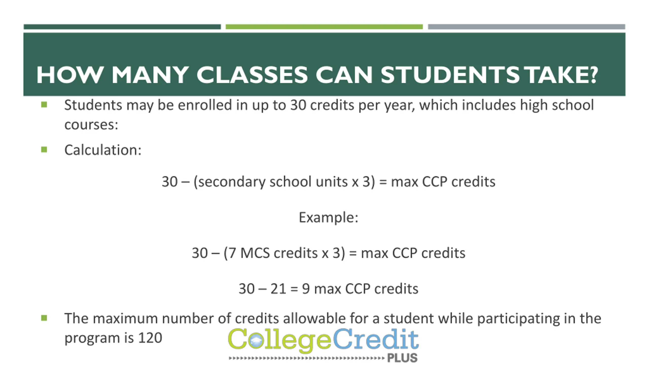 HOW MANY CLASSES CAN STUDENTS TAKE? Students may be enrolled in up to 30 credits per year, which includes high school courses: Calculation: 30 (secondary school units x 3) = max CCP credits Example: 30 (7 MCS credits x 3) = max CCP credits 30 21 = 9 max CCP credits The maximum number of credits allowable for a student while participating in the program is 120