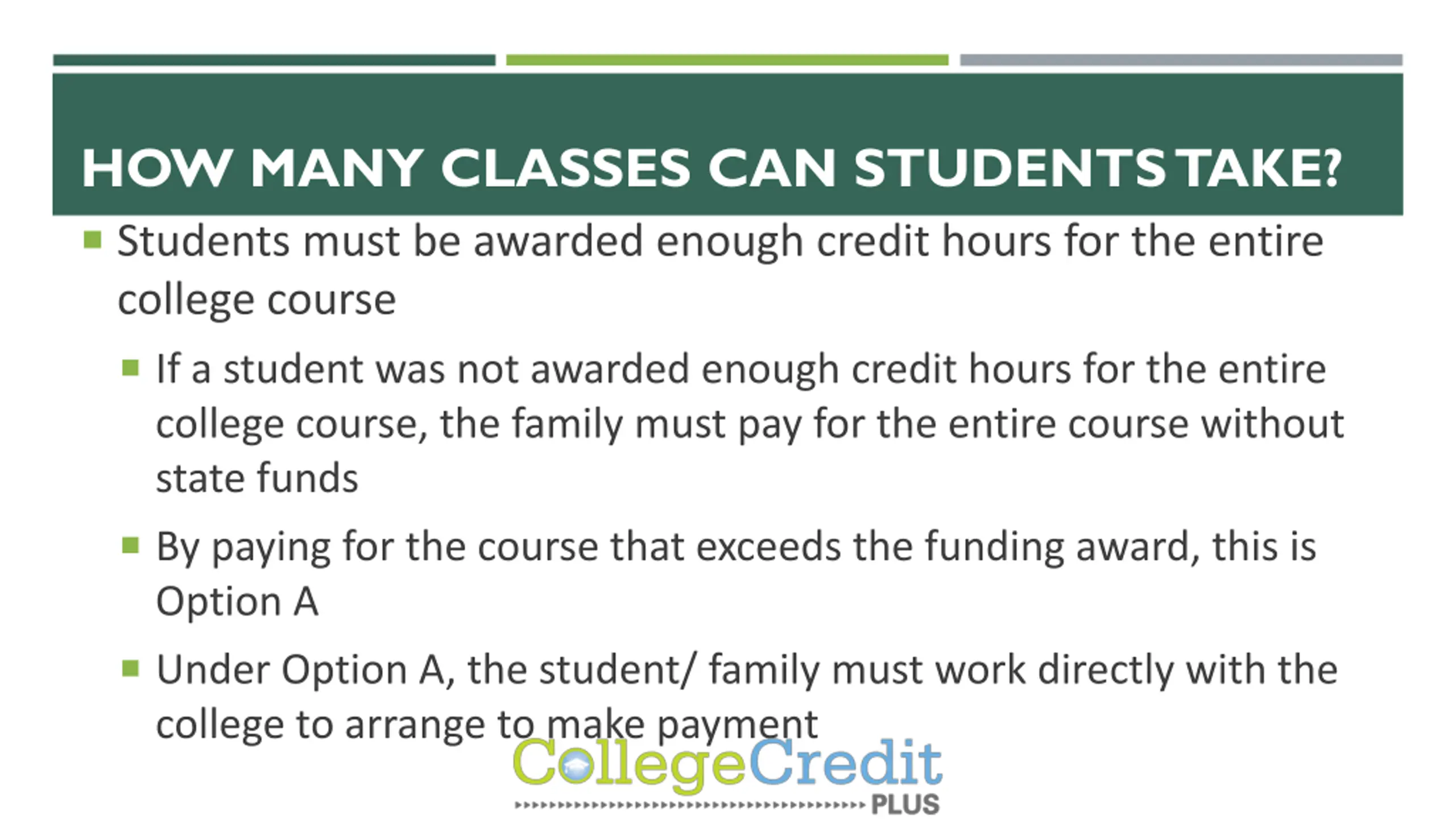 HOW MANY CLASSES CAN STUDENTS TAKE? Students must be awarded enough credit hours for the entire college course If a student was not awarded enough credit hours for the entire college course, the family must pay for the entire course without state funds By paying for the course that exceeds the funding award, this is Option A Under Option A, the student/ family must work directly with the college to arrange to make payment