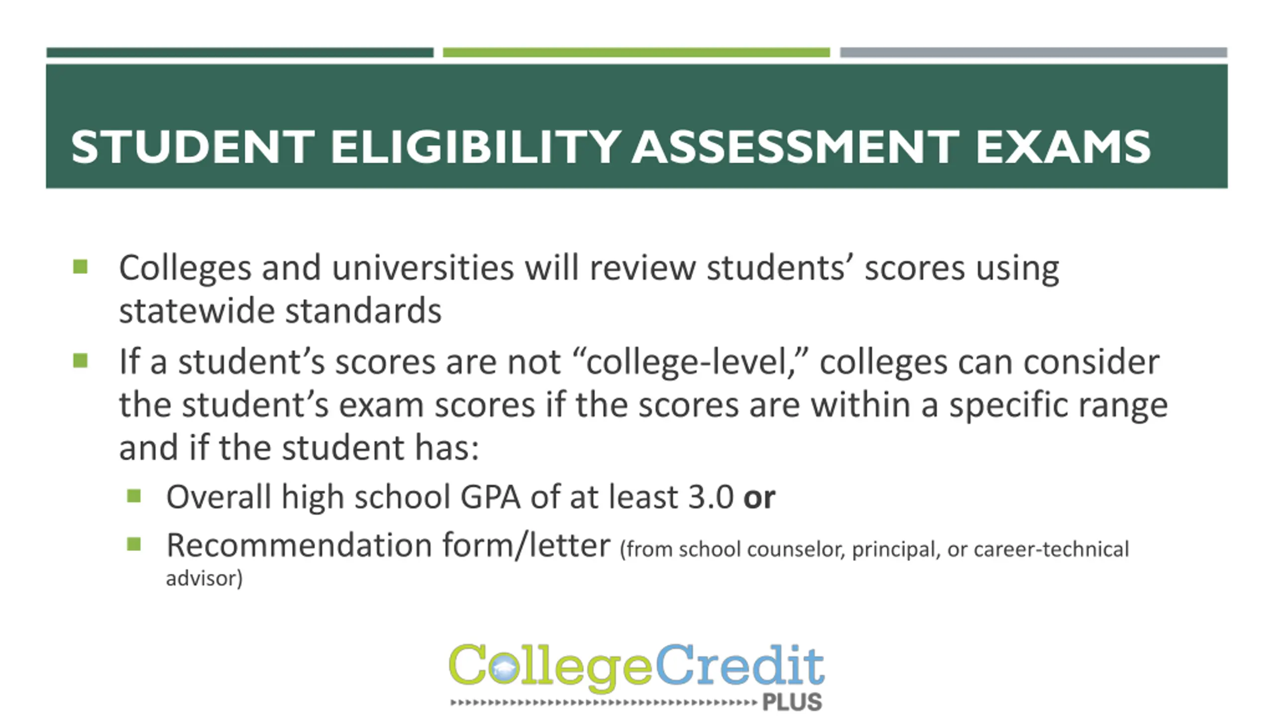 STUDENT ELIGIBILITY ASSESSMENT EXAMS Colleges and universities will review students scores using statewide standards If a student s scores are not college-level, colleges can consider the student s exam scores if the scores are within a specific range and if the student has: Overall high school GPA of at least 3.0 or Recommendation form/letter (from school counselor, principal, or career-technical advisor)