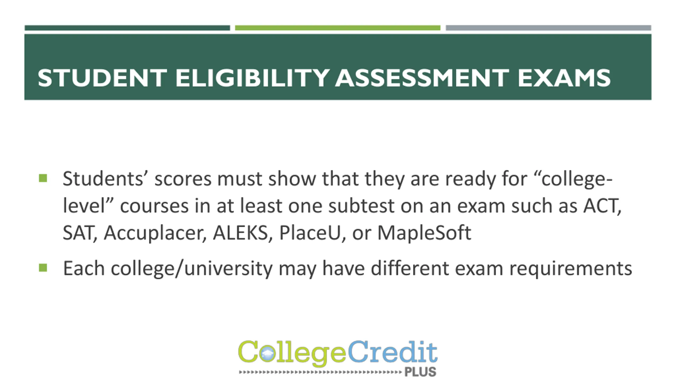 STUDENT ELIGIBILITY ASSESSMENT EXAMS Students scores must show that they are ready for college- level courses in at least one subtest on an exam such as ACT, SAT, Accuplacer, ALEKS, PlaceU, or MapleSoft Each college/university may have different exam requirements