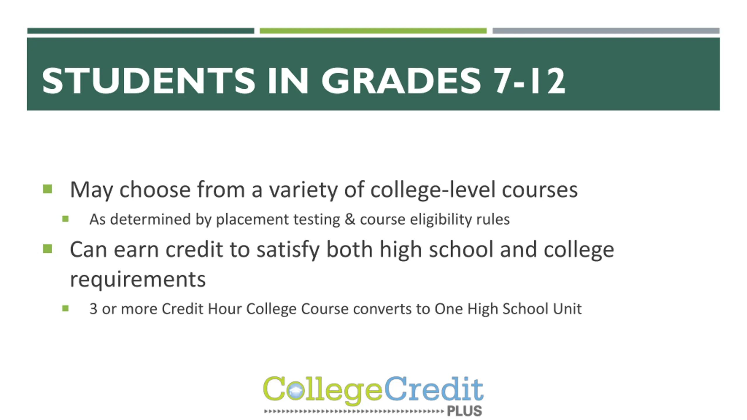 STUDENTS IN GRADES 7-12 May choose from a variety of college-level courses As determined by placement testing & course eligibility rules Can earn credit to satisfy both high school and college requirements 3 or more Credit Hour College Course converts to One High School Unit