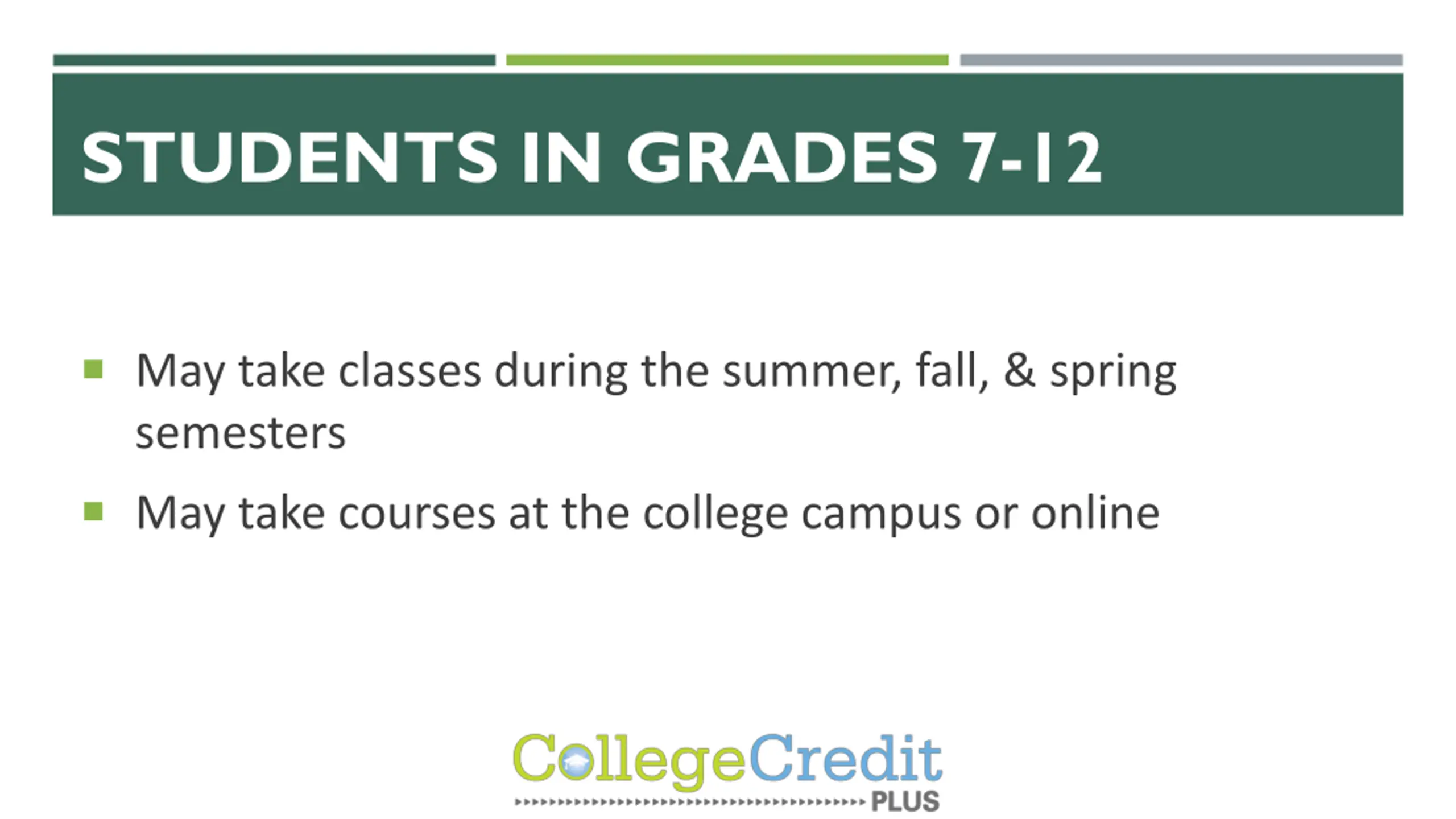 STUDENTS IN GRADES 7-12 May take classes during the summer, fall, & spring semesters May take courses at the college campus or online