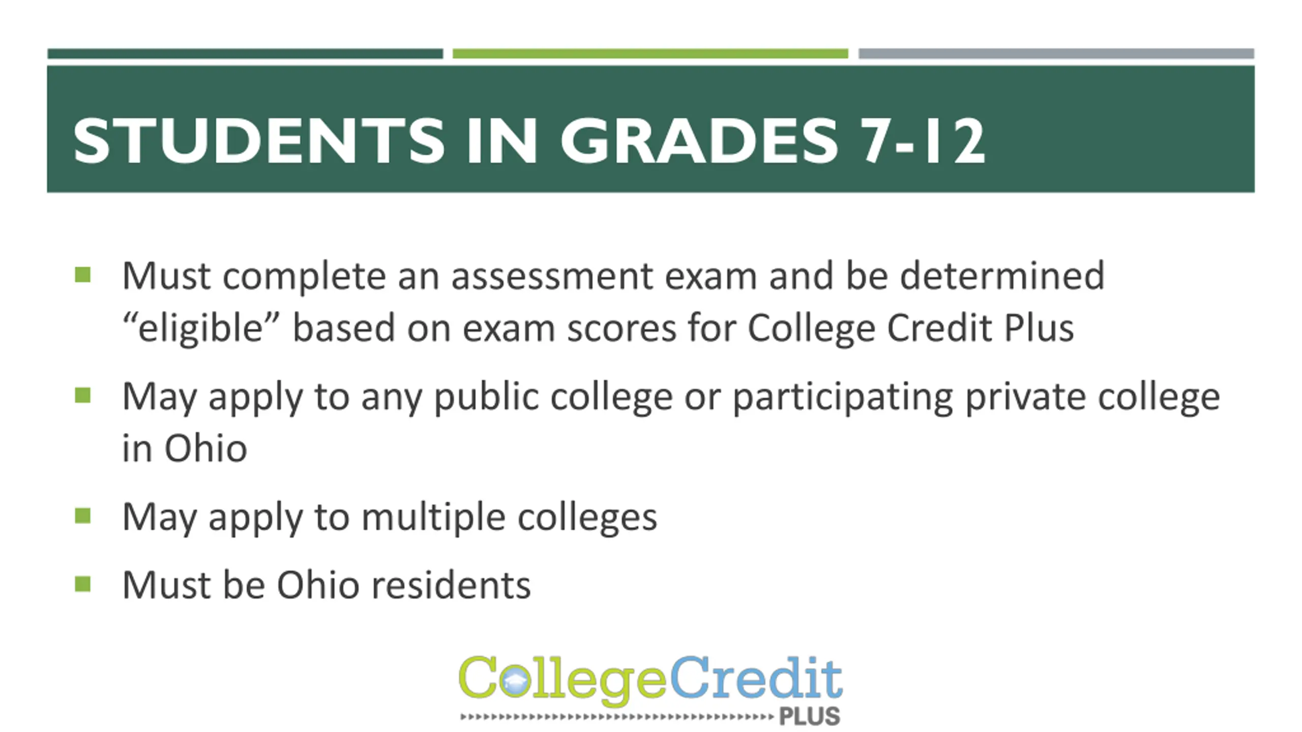 STUDENTS IN GRADES 7-12 Must complete an assessment exam and be determined eligible based on exam scores for College Credit Plus May apply to any public college or participating private college in Ohio May apply to multiple colleges Must be Ohio residents