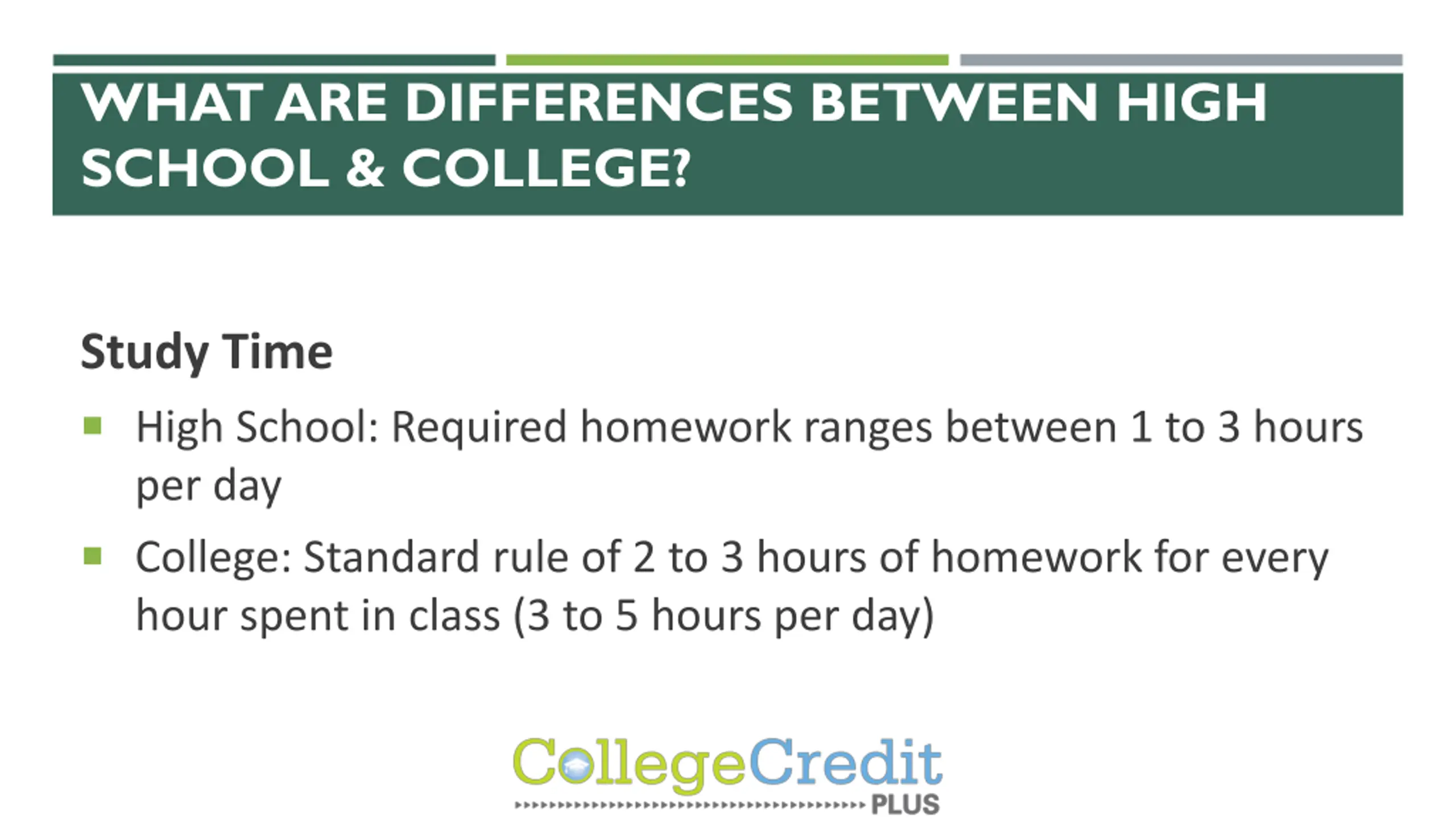 WHAT ARE DIFFERENCES BETWEEN HIGH SCHOOL & COLLEGE? Study Time High School: Required homework ranges between 1 to 3 hours per day College: Standard rule of 2 to 3 hours of homework for every hour spent in class (3 to 5 hours per day)