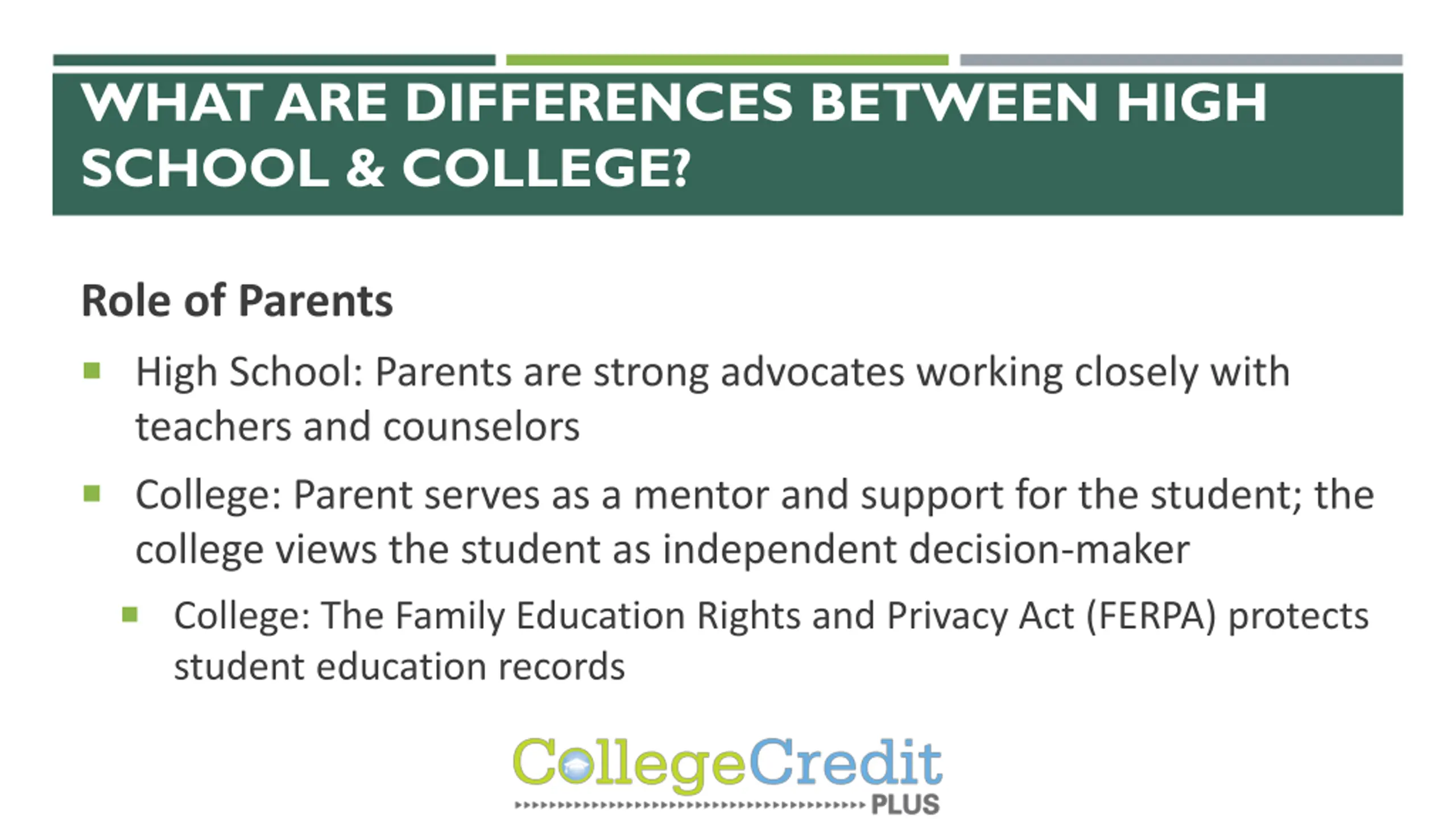 WHAT ARE DIFFERENCES BETWEEN HIGH SCHOOL & COLLEGE? Role of Parents High School: Parents are strong advocates working closely with teachers and counselors College: Parent serves as a mentor and support for the student; the college views the student as independent decision-maker College: The Family Education Rights and Privacy Act (FERPA) protects student education records