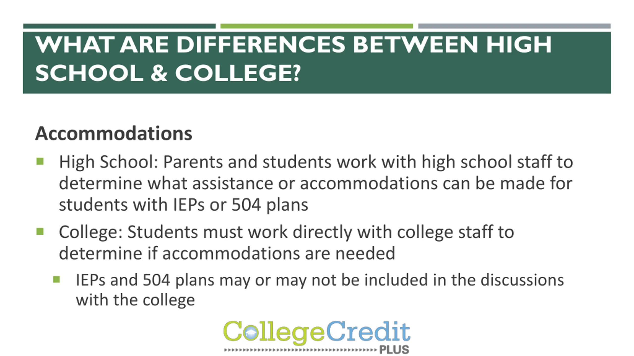 WHAT ARE DIFFERENCES BETWEEN HIGH SCHOOL & COLLEGE? Accommodations High School: Parents and students work with high school staff to determine what assistance or accommodations can be made for students with IEPs or 504 plans College: Students must work directly with college staff to determine if accommodations are needed IEPs and 504 plans may or may not be included in the discussions with the college